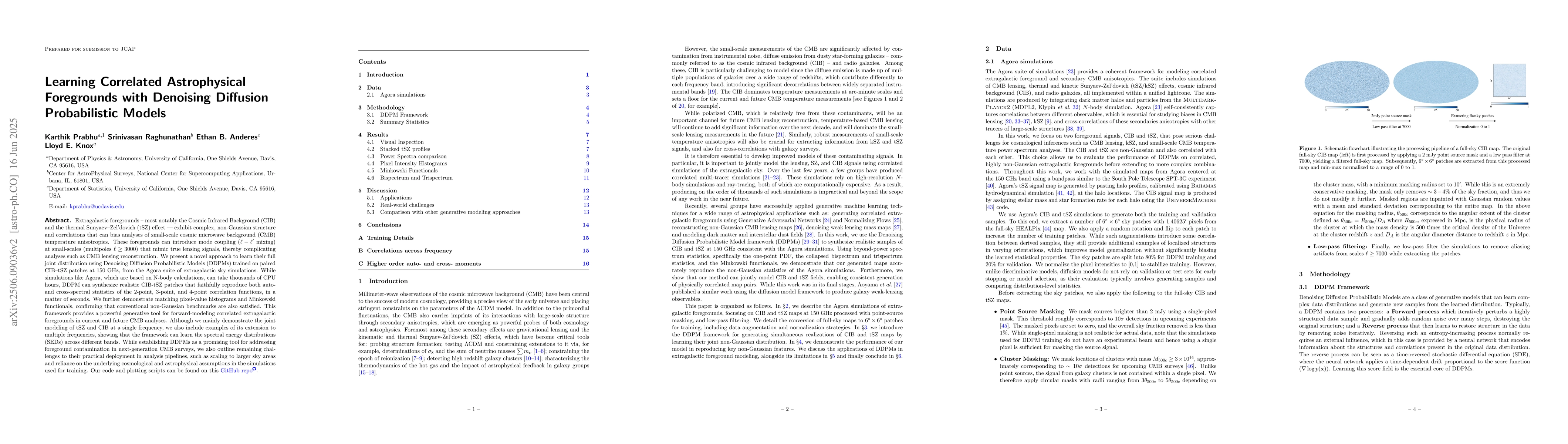 A new method uses Denoising Diffusion Probabilistic Models to learn the joint distribution of complex extragalactic foregrounds like Cosmic Infrared Background and thermal Sunyaev-Zel'dovich effect, providing a powerful tool for CMB analyses.