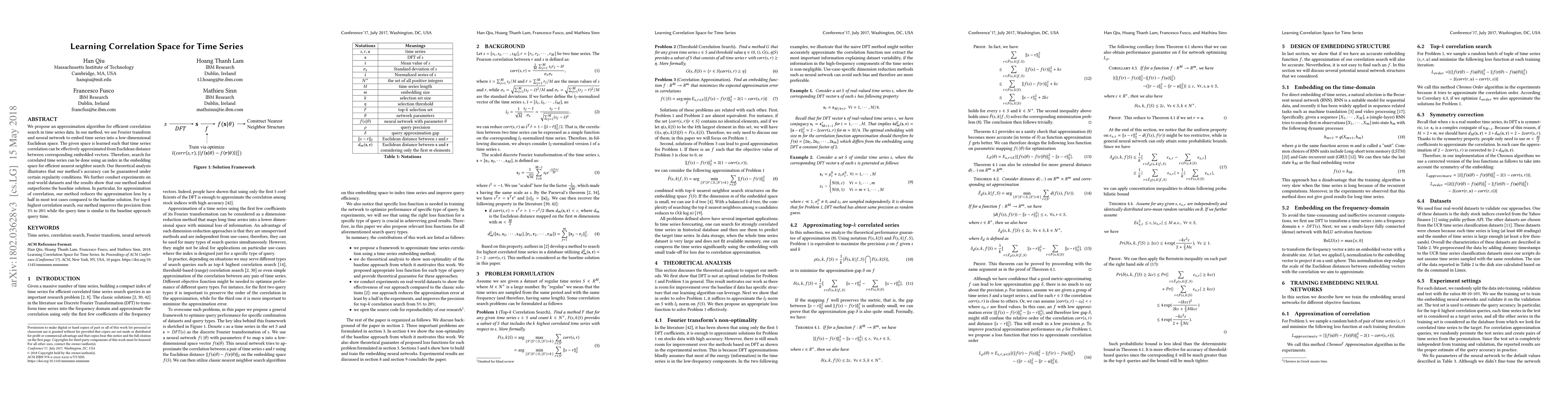 This paper proposes an efficient algorithm for time series correlation search using a Fourier transform and neural network to embed data into a low-dimensional space, enabling effective correlation approximation via Euclidean distance. Experimental results show that the method outperforms baselines by reducing approximation loss by half and improving top-k correlation search precision by 45% while maintaining similar query times.