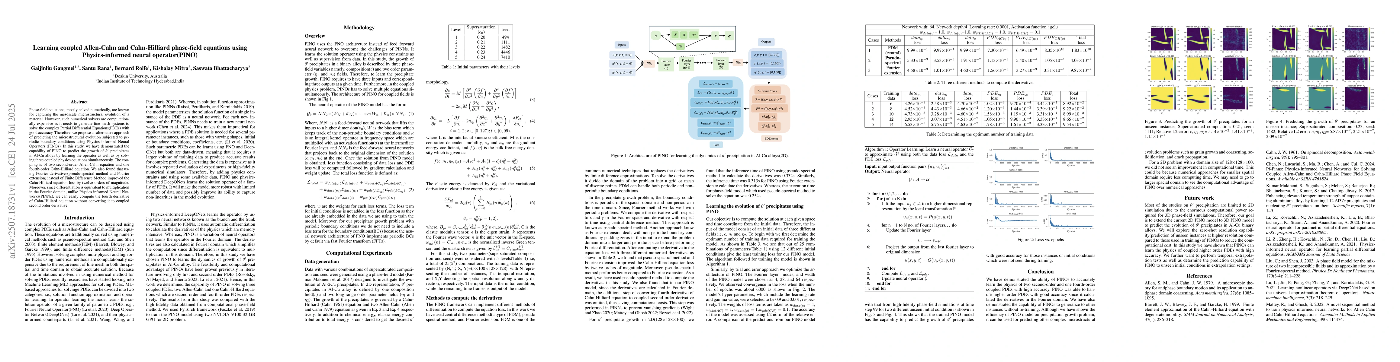 Phase-field equations, mostly solved numerically, are known for capturing the mesoscale microstructural evolution of a material. However, such numerical solvers are computationally expensive as it needs to generate fine mesh systems to solve the complex Partial Differential Equations(PDEs) with good accuracy. Therefore, we propose an alternative approach of predicting the microstructural evolution subjected to periodic boundary conditions using Physics informed Neural Operators (PINOs). In this study, we have demonstrated the capability of PINO to predict the growth of $\theta^{\prime}$ precipitates in Al-Cu alloys by learning the operator as well as by solving three coupled physics equations simultaneously. The coupling is of two second-order Allen-Cahn equation and one fourth-order Cahn-Hilliard equation. We also found that using Fourier derivatives(pseudo-spectral method and Fourier extension) instead of Finite Difference Method improved the Cahn-Hilliard equation loss by twelve orders of magnitude. Moreover, since differentiation is equivalent to multiplication in the Fourier domain, unlike Physics informed Neural Networks(PINNs), we can easily compute the fourth derivative of Cahn-Hilliard equation without converting it to coupled second order derivative.