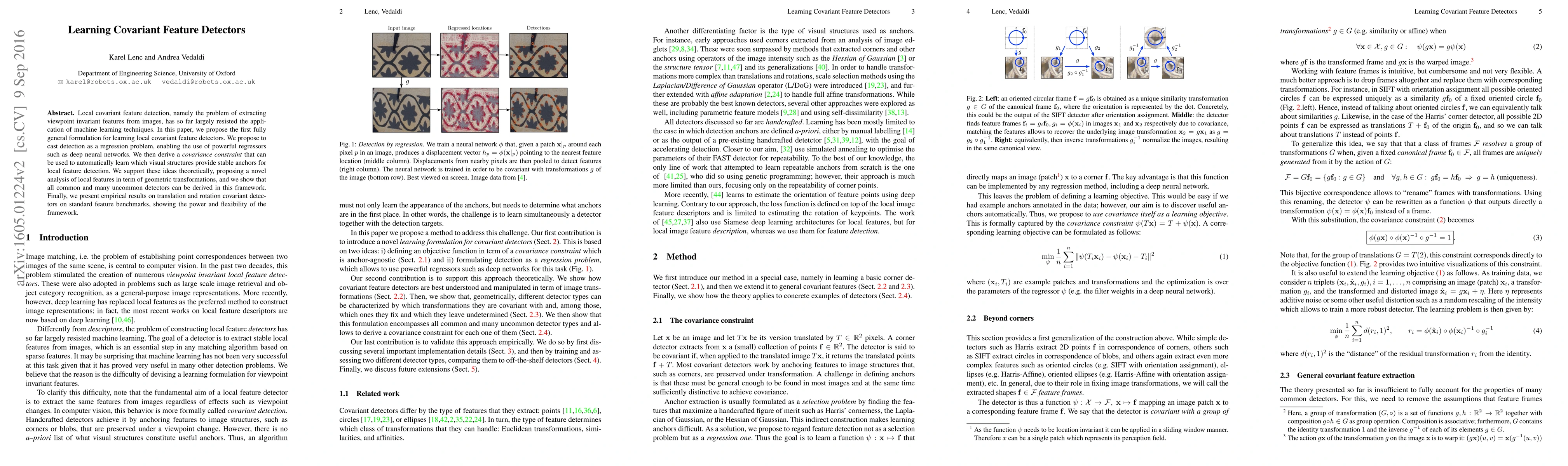 Local covariant feature detection, namely the problem of extracting viewpoint invariant features from images, has so far largely resisted the application of machine learning techniques. In this paper, we propose the first fully general formulation for learning local covariant feature detectors. We propose to cast detection as a regression problem, enabling the use of powerful regressors such as deep neural networks. We then derive a covariance constraint that can be used to automatically learn which visual structures provide stable anchors for local feature detection. We support these ideas theoretically, proposing a novel analysis of local features in term of geometric transformations, and we show that all common and many uncommon detectors can be derived in this framework. Finally, we present empirical results on translation and rotation covariant detectors on standard feature benchmarks, showing the power and flexibility of the framework.