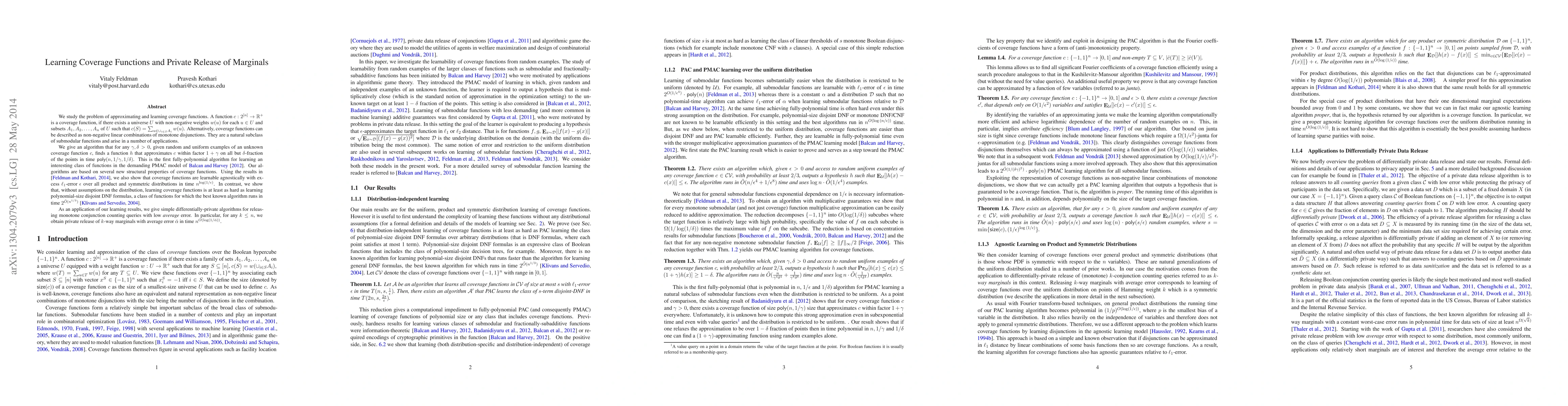 We study the problem of approximating and learning coverage functions. A function $c: 2^{[n]} \rightarrow \mathbf{R}^{+}$ is a coverage function, if there exists a universe $U$ with non-negative weights $w(u)$ for each $u \in U$ and subsets $A_1, A_2, \ldots, A_n$ of $U$ such that $c(S) = \sum_{u \in \cup_{i \in S} A_i} w(u)$. Alternatively, coverage functions can be described as non-negative linear combinations of monotone disjunctions. They are a natural subclass of submodular functions and arise in a number of applications. We give an algorithm that for any $\gamma,\delta>0$, given random and uniform examples of an unknown coverage function $c$, finds a function $h$ that approximates $c$ within factor $1+\gamma$ on all but $\delta$-fraction of the points in time $poly(n,1/\gamma,1/\delta)$. This is the first fully-polynomial algorithm for learning an interesting class of functions in the demanding PMAC model of Balcan and Harvey (2011). Our algorithms are based on several new structural properties of coverage functions. Using the results in (Feldman and Kothari, 2014), we also show that coverage functions are learnable agnostically with excess $\ell_1$-error $\epsilon$ over all product and symmetric distributions in time $n^{\log(1/\epsilon)}$. In contrast, we show that, without assumptions on the distribution, learning coverage functions is at least as hard as learning polynomial-size disjoint DNF formulas, a class of functions for which the best known algorithm runs in time $2^{\tilde{O}(n^{1/3})}$ (Klivans and Servedio, 2004). As an application of our learning results, we give simple differentially-private algorithms for releasing monotone conjunction counting queries with low average error. In particular, for any $k \leq n$, we obtain private release of $k$-way marginals with average error $\bar{\alpha}$ in time $n^{O(\log(1/\bar{\alpha}))}$.