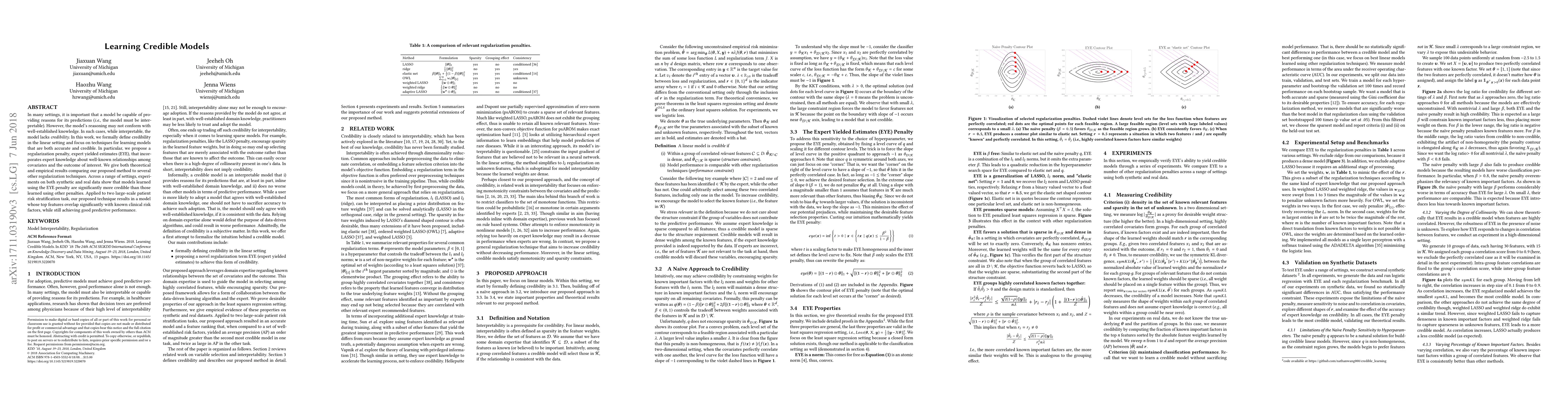 In many settings, it is important that a model be capable of providing reasons for its predictions (i.e., the model must be interpretable). However, the model's reasoning may not conform with well-established knowledge. In such cases, while interpretable, the model lacks \textit{credibility}. In this work, we formally define credibility in the linear setting and focus on techniques for learning models that are both accurate and credible. In particular, we propose a regularization penalty, expert yielded estimates (EYE), that incorporates expert knowledge about well-known relationships among covariates and the outcome of interest. We give both theoretical and empirical results comparing our proposed method to several other regularization techniques. Across a range of settings, experiments on both synthetic and real data show that models learned using the EYE penalty are significantly more credible than those learned using other penalties. Applied to a large-scale patient risk stratification task, our proposed technique results in a model whose top features overlap significantly with known clinical risk factors, while still achieving good predictive performance.