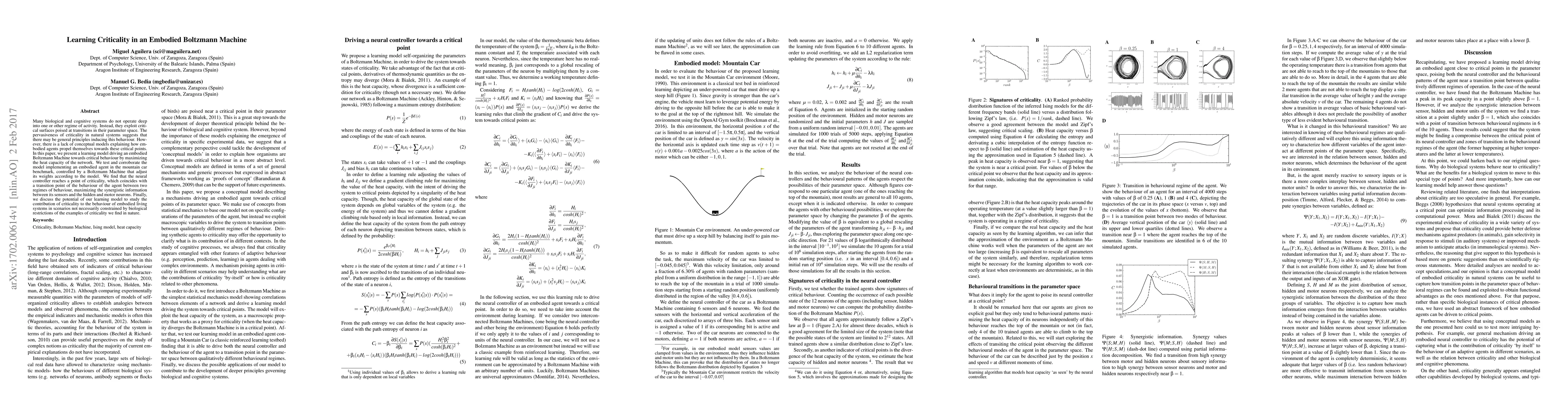 This paper proposes a learning model to guide an embodied Boltzmann Machine towards critical behaviour by maximizing the network's heat capacity. The model is tested on an embodied agent in the mountain car benchmark, demonstrating the transition to criticality and enhanced information synergy between sensors and neural components.