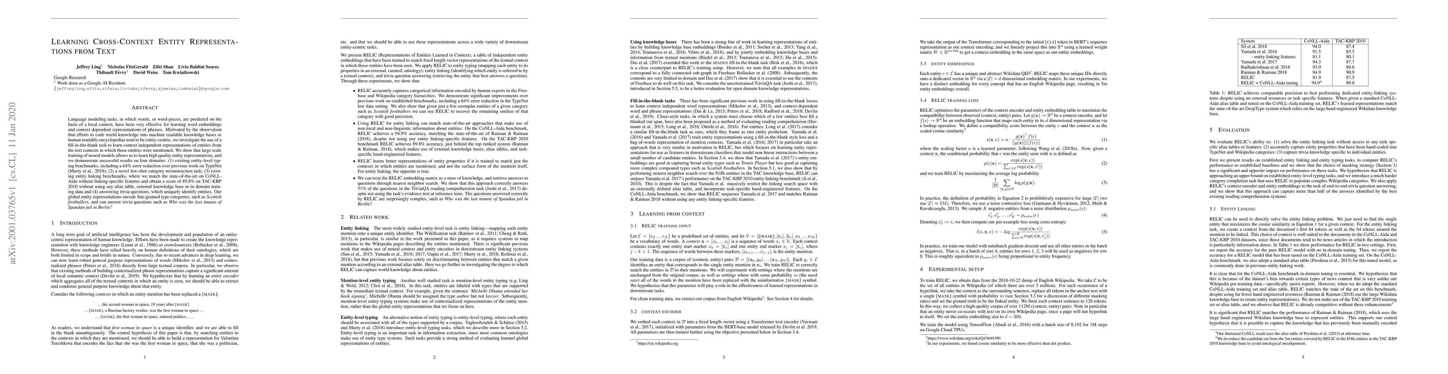 Language modeling tasks, in which words, or word-pieces, are predicted on the basis of a local context, have been very effective for learning word embeddings and context dependent representations of phrases. Motivated by the observation that efforts to code world knowledge into machine readable knowledge bases or human readable encyclopedias tend to be entity-centric, we investigate the use of a fill-in-the-blank task to learn context independent representations of entities from the text contexts in which those entities were mentioned. We show that large scale training of neural models allows us to learn high quality entity representations, and we demonstrate successful results on four domains: (1) existing entity-level typing benchmarks, including a 64% error reduction over previous work on TypeNet (Murty et al., 2018); (2) a novel few-shot category reconstruction task; (3) existing entity linking benchmarks, where we match the state-of-the-art on CoNLL-Aida without linking-specific features and obtain a score of 89.8% on TAC-KBP 2010 without using any alias table, external knowledge base or in domain training data and (4) answering trivia questions, which uniquely identify entities. Our global entity representations encode fine-grained type categories, such as Scottish footballers, and can answer trivia questions such as: Who was the last inmate of Spandau jail in Berlin?