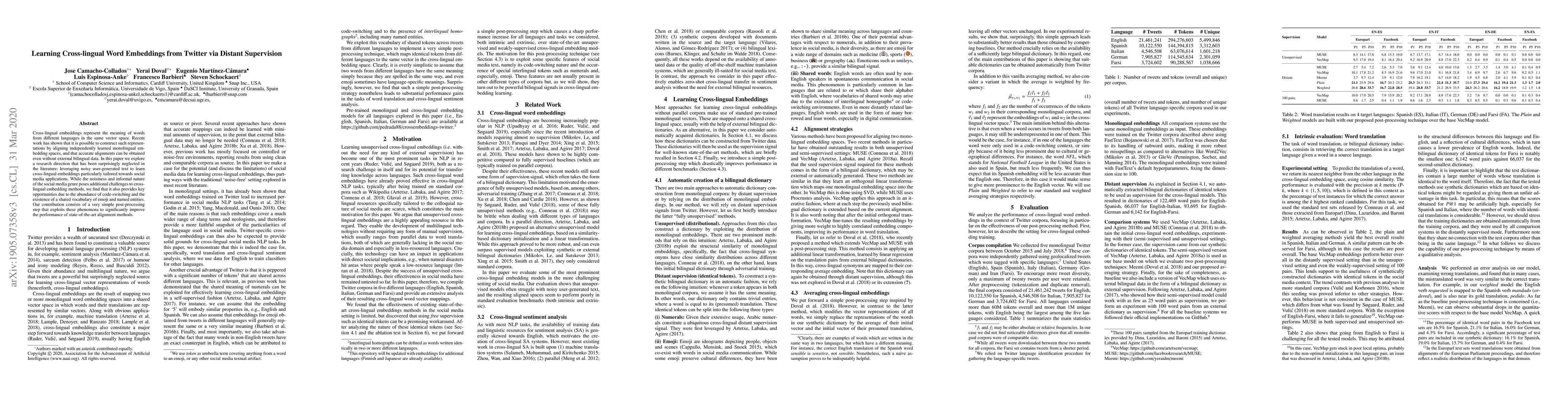 This paper explores leveraging noisy Twitter data to develop cross-lingual embeddings, focusing on social media's unique features like code-switching and shared emoji. A simple post-processing step significantly enhances state-of-the-art alignment methods.