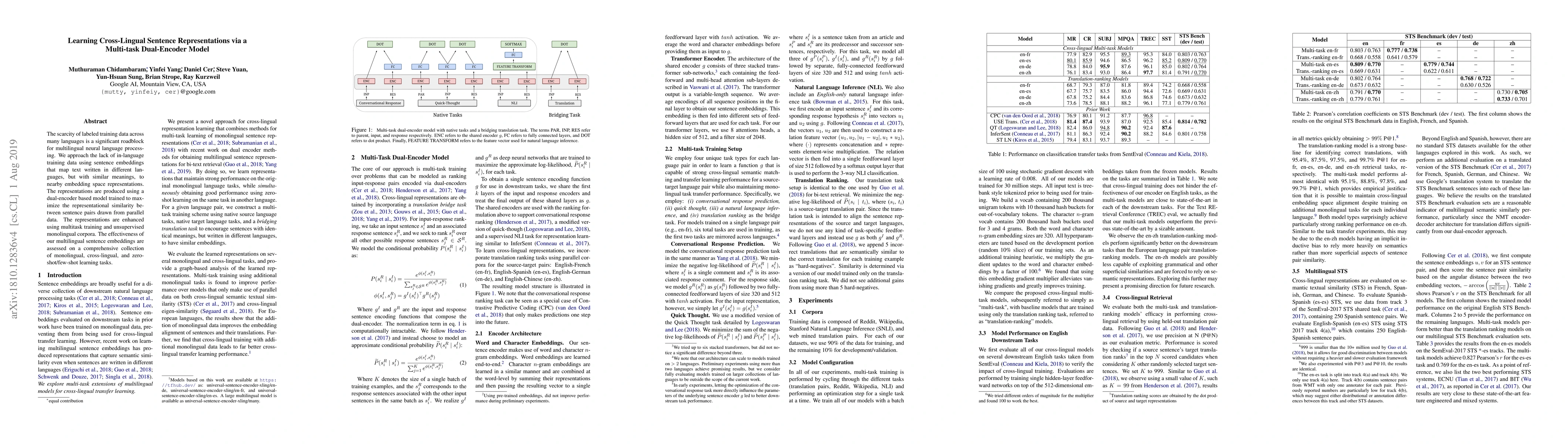 This paper proposes a multi-task dual-encoder model to learn cross-lingual sentence representations, aiming to transfer performance from English to non-English tasks with limited non-English data. The model is evaluated on various monolingual, cross-lingual, and zero-shot/few-shot learning tasks to demonstrate its effectiveness.