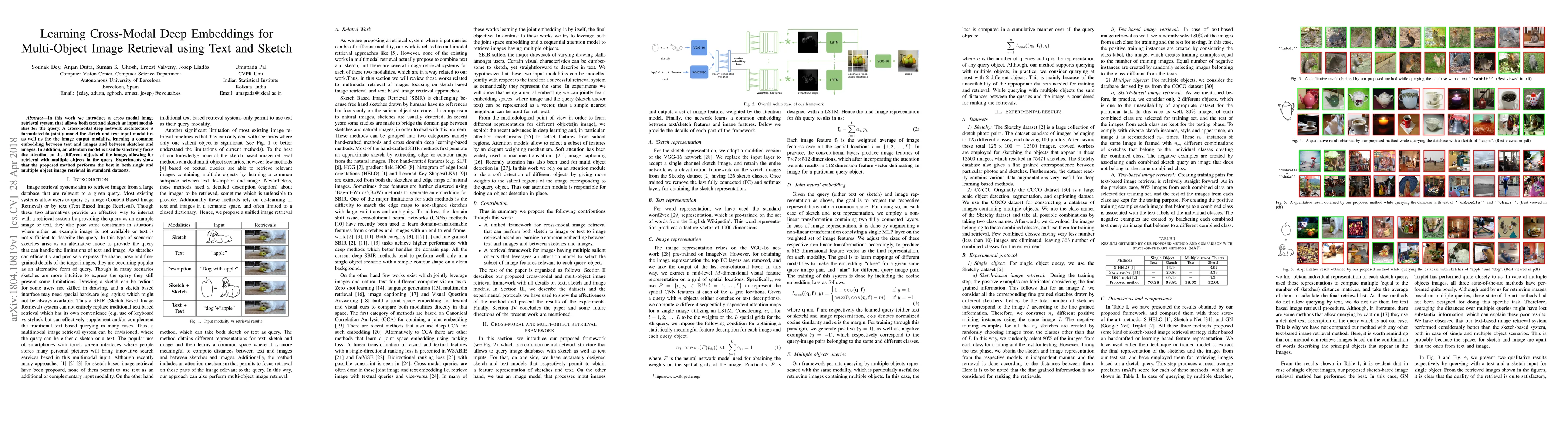 This paper proposes a cross-modal deep network for multi-object image retrieval using both text and sketch inputs. The system learns common embeddings between text/sketch and images, and an attention model enhances focus on different objects in images, achieving superior performance in retrieval tasks.