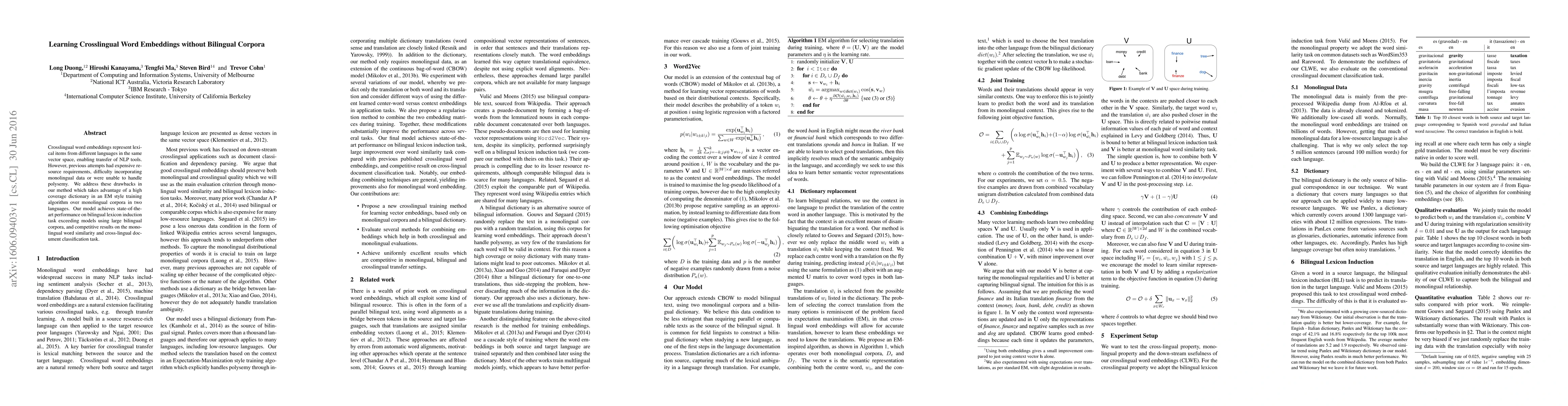 This paper proposes a method for learning crosslingual word embeddings using an EM-style algorithm over monolingual corpora, eliminating the need for bilingual corpora. The approach achieves state-of-the-art results on lexicon induction and competitive performance on word similarity and document classification tasks.