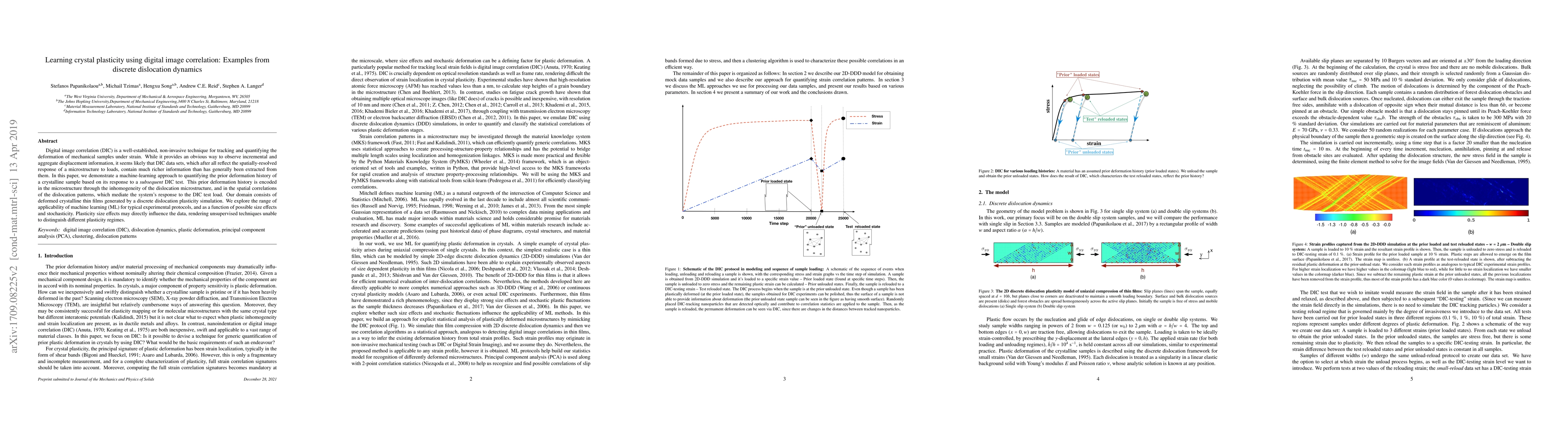Digital image correlation (DIC) is a well-established, non-invasive technique for tracking and quantifying the deformation of mechanical samples under strain. While it provides an obvious way to observe incremental and aggregate displacement information, it seems likely that DIC data sets, which after all reflect the spatially-resolved response of a microstructure to loads, contain much richer information than has generally been extracted from them. In this paper, we demonstrate a machine-learning approach to quantifying the prior deformation history of a crystalline sample based on its response to a subsequent DIC test. This prior deformation history is encoded in the microstructure through the inhomogeneity of the dislocation microstructure, and in the spatial correlations of the dislocation patterns, which mediate the system's response to the DIC test load. Our domain consists of deformed crystalline thin films generated by a discrete dislocation plasticity simulation. We explore the range of applicability of machine learning (ML) for typical experimental protocols, and as a function of possible size effects and stochasticity. Plasticity size effects may directly influence the data, rendering unsupervised techniques unable to distinguish different plasticity regimes.