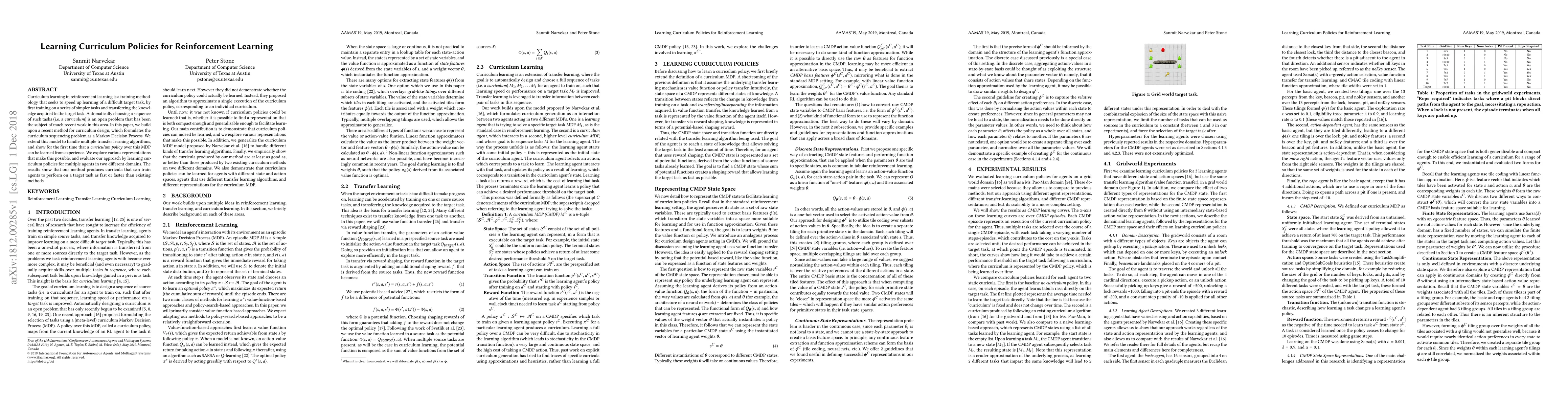 This paper extends a reinforcement learning method for curriculum design, formulating the curriculum sequencing problem as a Markov Decision Process. It demonstrates that a curriculum policy can be learned from experience, showing improved or equivalent performance compared to existing methods across multiple agents and domains.