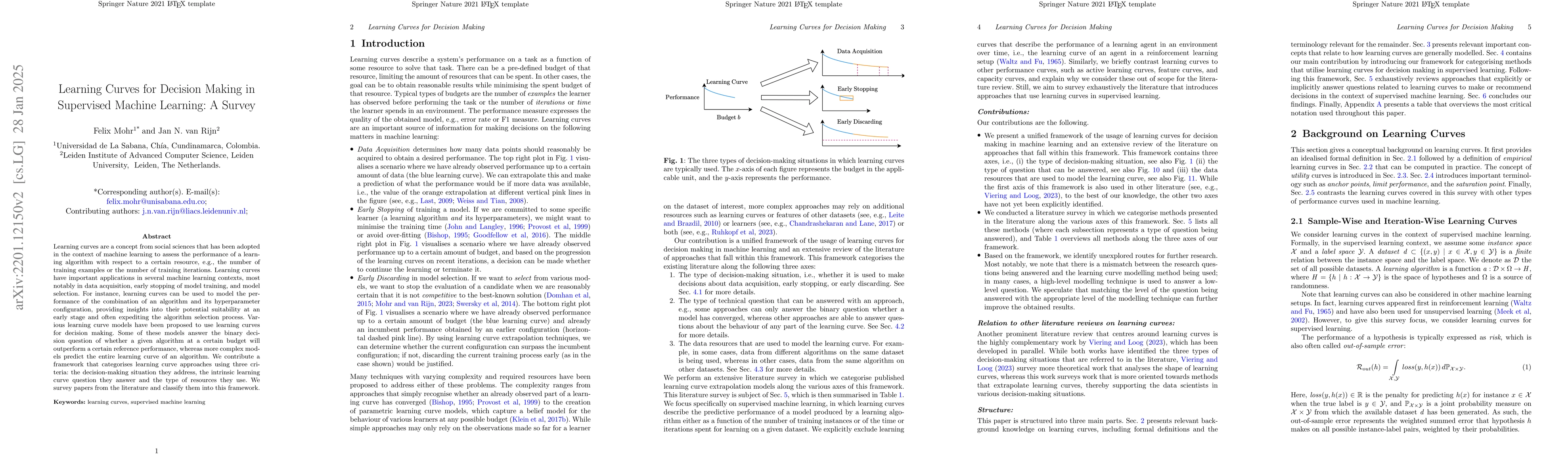 Learning curves are a concept from social sciences that has been adopted in the context of machine learning to assess the performance of a learning algorithm with respect to a certain resource, e.g. the number of training examples or the number of training iterations. Learning curves have important applications in several contexts of machine learning, most importantly for the context of data acquisition, early stopping of model training and model selection. For example, by modelling the learning curves, one can assess at an early stage whether the algorithm and hyperparameter configuration have the potential to be a suitable choice, often speeding up the algorithm selection process. A variety of approaches has been proposed to use learning curves for decision making. Some models answer the binary decision question of whether a certain algorithm at a certain budget will outperform a certain reference performance, whereas more complex models predict the entire learning curve of an algorithm. We contribute a framework that categorizes learning curve approaches using three criteria: the decision situation that they address, the intrinsic learning curve question that they answer and the type of resources that they use. We survey papers from literature and classify them into this framework.