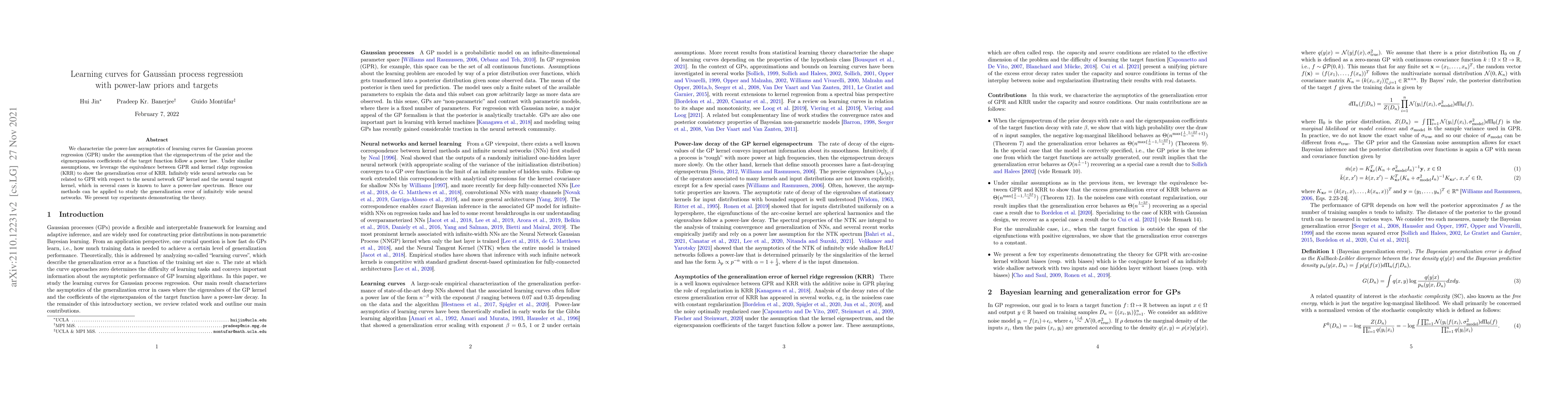 This paper characterizes the asymptotic behavior of learning curves for Gaussian process regression (GPR) when both the prior and target function follow power-law distributions. It leverages the equivalence between GPR and kernel ridge regression (KRR) to analyze generalization error, and extends the findings to infinitely wide neural networks, supported by toy experiments.