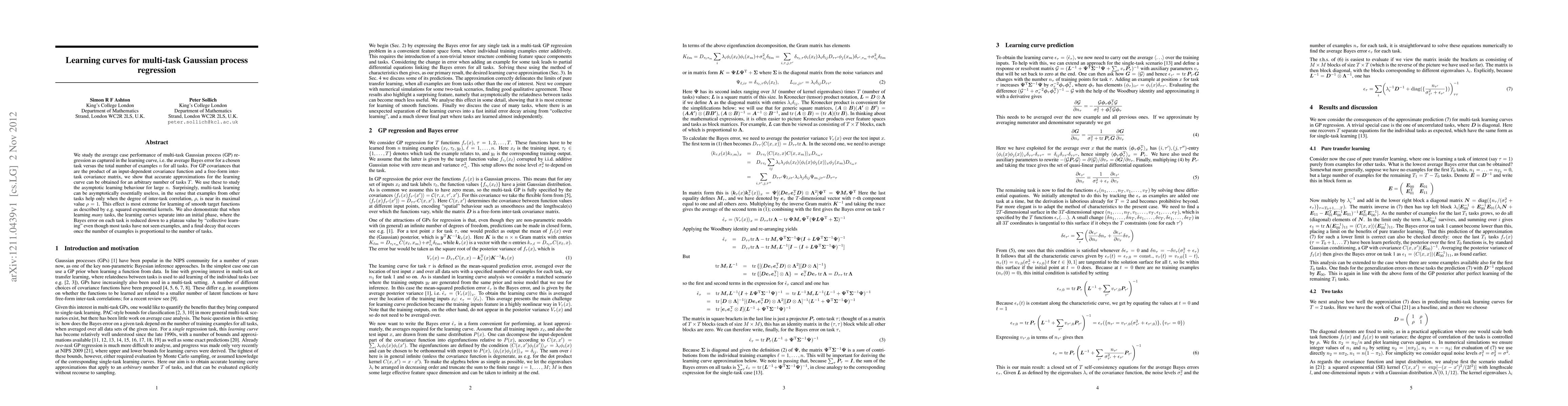 This paper investigates the learning curve for multi-task Gaussian process regression, revealing that multi-task learning is only effective when inter-task correlation is high. It shows that learning curves separate into an initial phase of collective learning followed by a final decay phase as more examples are gathered.
