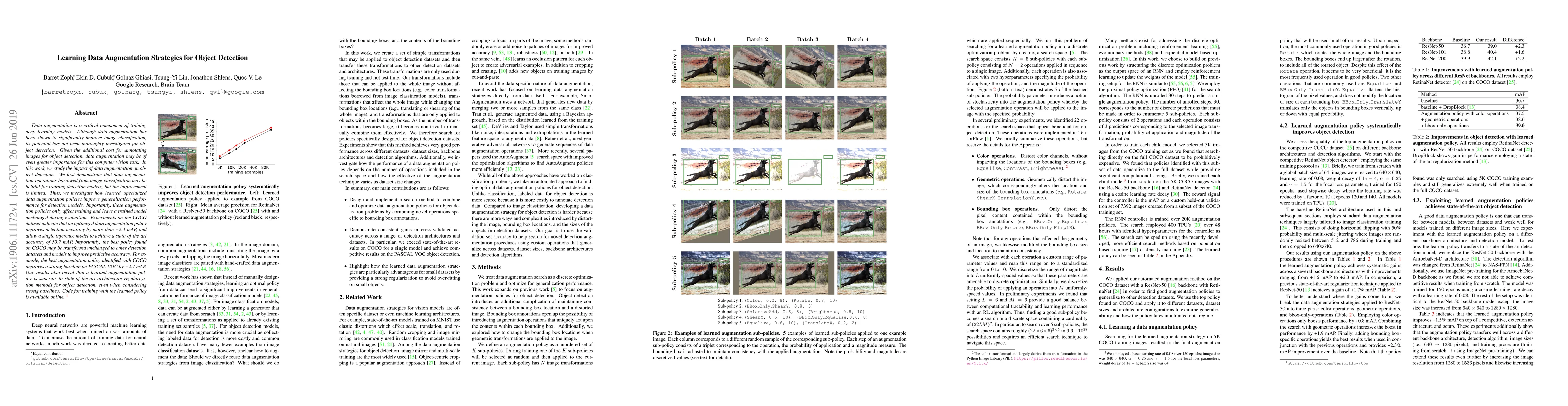 Data augmentation is a critical component of training deep learning models. Although data augmentation has been shown to significantly improve image classification, its potential has not been thoroughly investigated for object detection. Given the additional cost for annotating images for object detection, data augmentation may be of even greater importance for this computer vision task. In this work, we study the impact of data augmentation on object detection. We first demonstrate that data augmentation operations borrowed from image classification may be helpful for training detection models, but the improvement is limited. Thus, we investigate how learned, specialized data augmentation policies improve generalization performance for detection models. Importantly, these augmentation policies only affect training and leave a trained model unchanged during evaluation. Experiments on the COCO dataset indicate that an optimized data augmentation policy improves detection accuracy by more than +2.3 mAP, and allow a single inference model to achieve a state-of-the-art accuracy of 50.7 mAP. Importantly, the best policy found on COCO may be transferred unchanged to other detection datasets and models to improve predictive accuracy. For example, the best augmentation policy identified with COCO improves a strong baseline on PASCAL-VOC by +2.7 mAP. Our results also reveal that a learned augmentation policy is superior to state-of-the-art architecture regularization methods for object detection, even when considering strong baselines. Code for training with the learned policy is available online at https://github.com/tensorflow/tpu/tree/master/models/official/detection