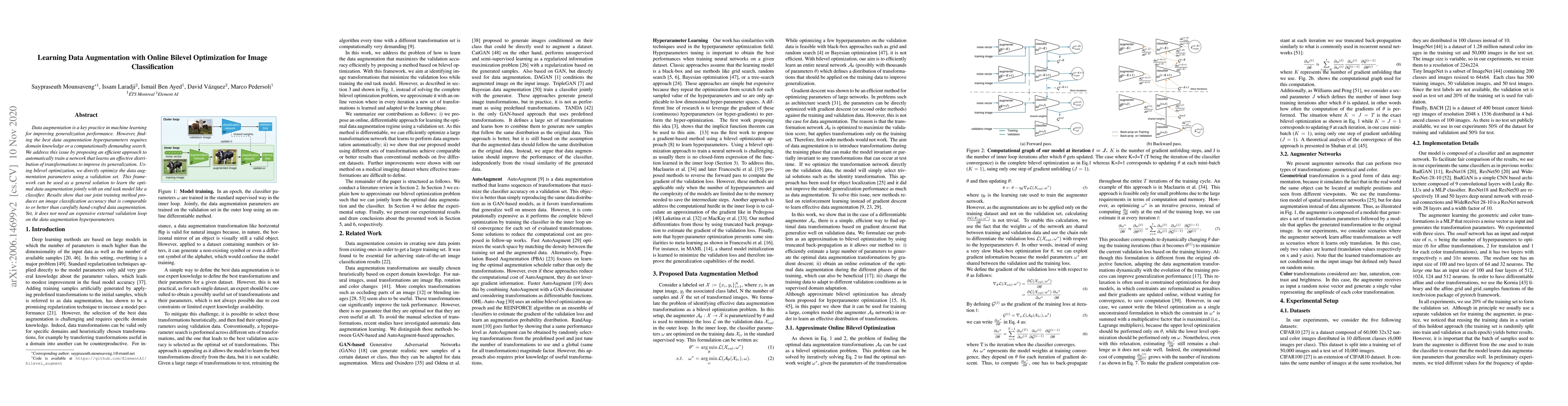 This paper proposes an efficient online bilevel optimization method to automatically learn optimal data augmentation strategies for image classification, eliminating the need for costly hyperparameter searches. The approach jointly trains the augmentation network with the classifier, achieving comparable or better classification accuracy than traditional handcrafted methods.