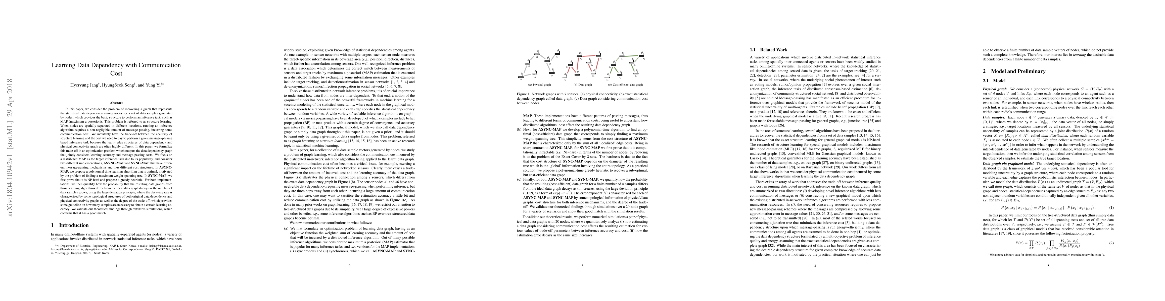 This paper addresses the challenge of learning data dependency graphs while considering communication costs in distributed inference tasks. It proposes optimization methods to balance learning accuracy and message-passing costs, introducing algorithms for asynchronous and synchronous MAP inference, and validates the theoretical results with simulations.