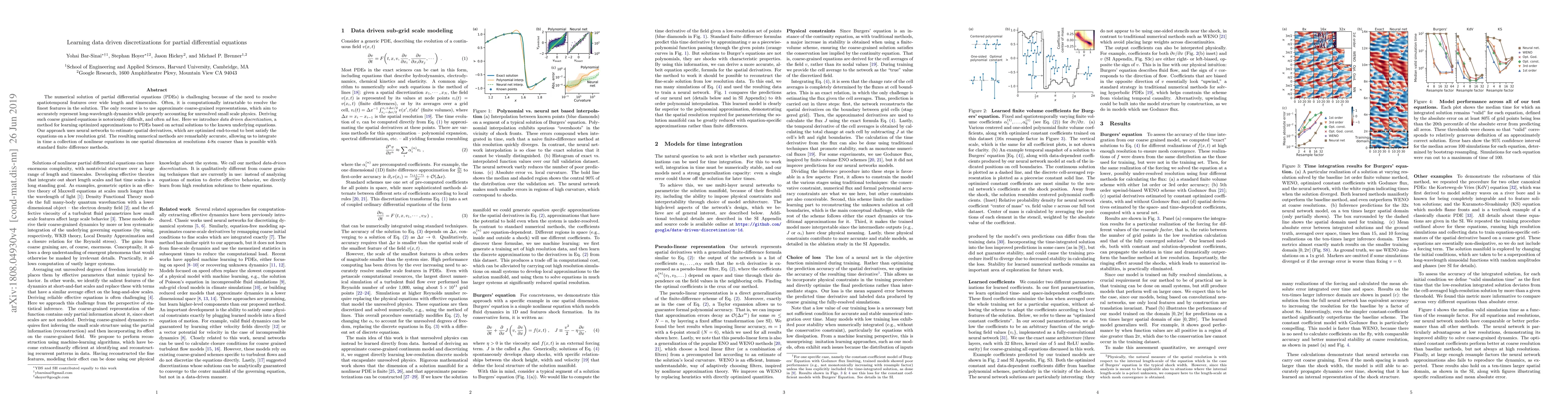 This paper proposes a data-driven discretization method using neural networks to learn optimized approximations for solving partial differential equations (PDEs). The method accurately integrates nonlinear PDEs at resolutions significantly coarser than standard finite difference methods, demonstrating improved accuracy and efficiency.