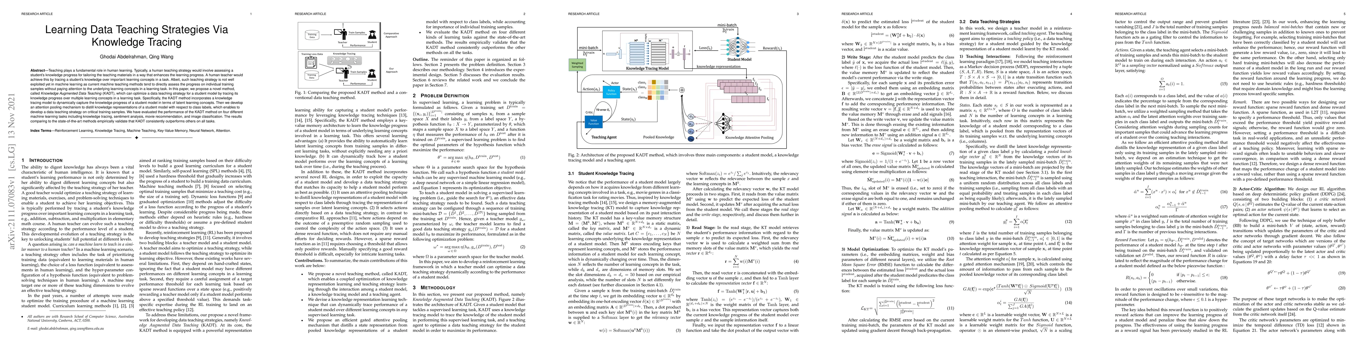 A new method called Knowledge Augmented Data Teaching (KADT) is proposed to optimize data teaching strategies for student models by tracing knowledge progress over multiple learning concepts. KADT outperforms state-of-the-art methods on four different machine learning tasks.