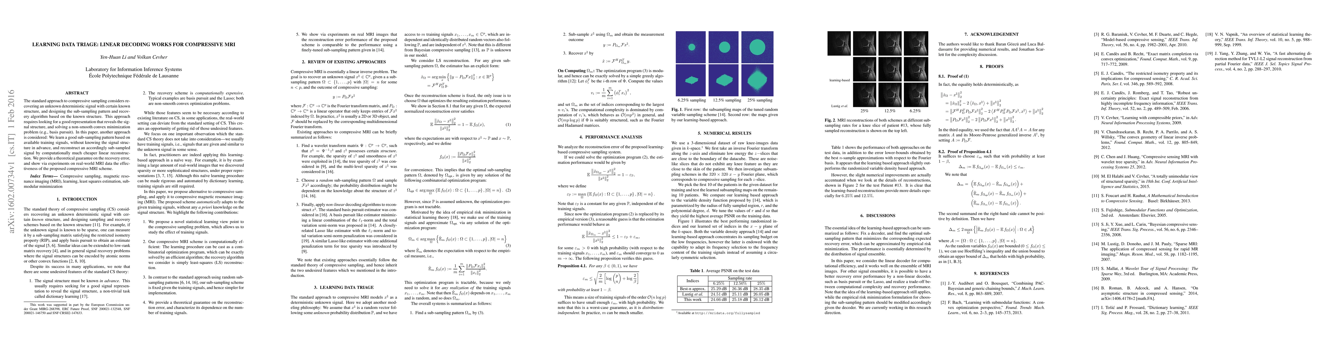 The standard approach to compressive sampling considers recovering an unknown deterministic signal with certain known structure, and designing the sub-sampling pattern and recovery algorithm based on the known structure. This approach requires looking for a good representation that reveals the signal structure, and solving a non-smooth convex minimization problem (e.g., basis pursuit). In this paper, another approach is considered: We learn a good sub-sampling pattern based on available training signals, without knowing the signal structure in advance, and reconstruct an accordingly sub-sampled signal by computationally much cheaper linear reconstruction. We provide a theoretical guarantee on the recovery error, and show via experiments on real-world MRI data the effectiveness of the proposed compressive MRI scheme.