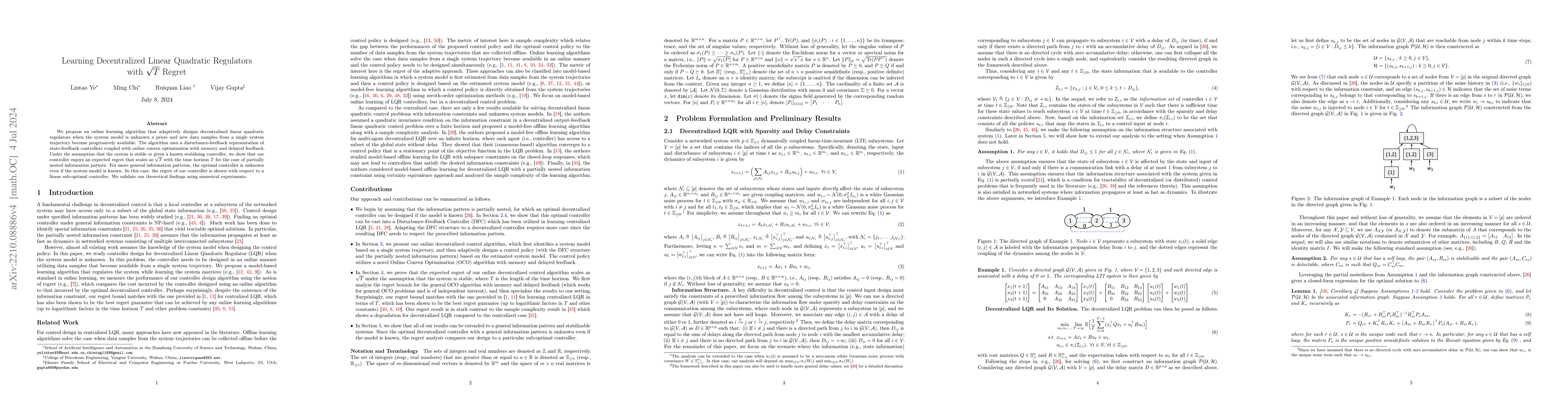 This paper proposes an online learning algorithm for a decentralized linear quadratic regulator (LQR) under unknown system models, achieving $\sqrt{T}$ regret scaling over time. The algorithm utilizes disturbance-feedback and online convex optimization, validated through numerical experiments.