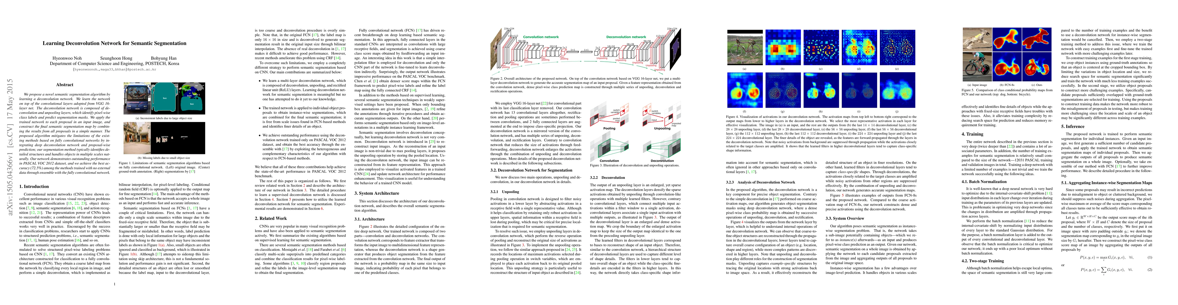 This paper introduces a semantic segmentation algorithm using a deconvolution network built on top of VGG's convolutional layers. The network combines deconvolution and unpooling layers to predict pixel-wise class labels and segmentation masks, achieving superior performance on the PASCAL VOC 2012 dataset and outperforming other methods by identifying detailed structures and handling objects of various scales.