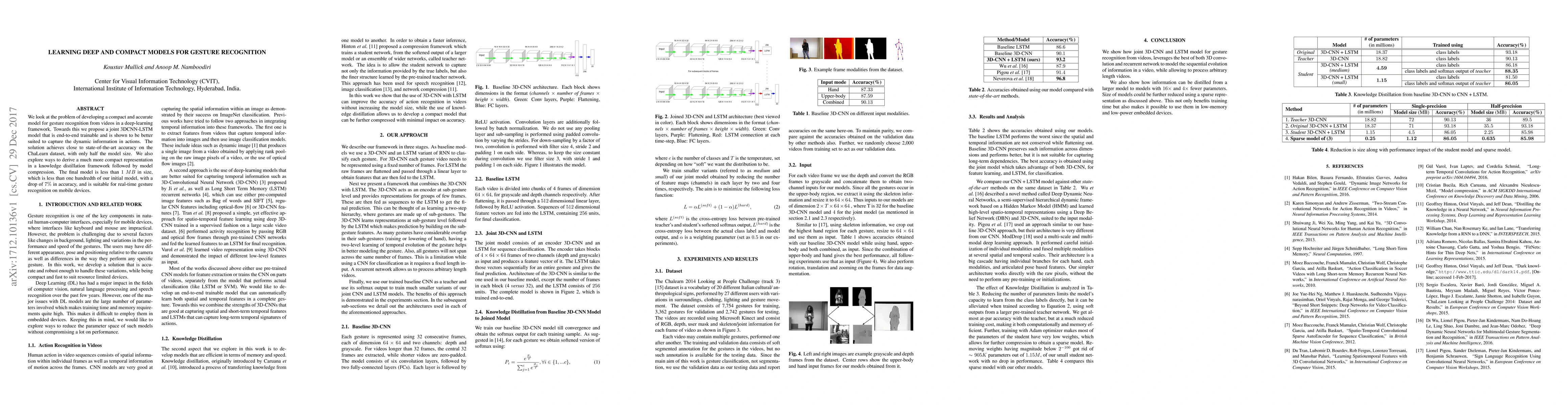 We look at the problem of developing a compact and accurate model for gesture recognition from videos in a deep-learning framework. Towards this we propose a joint 3DCNN-LSTM model that is end-to-end trainable and is shown to be better suited to capture the dynamic information in actions. The solution achieves close to state-of-the-art accuracy on the ChaLearn dataset, with only half the model size. We also explore ways to derive a much more compact representation in a knowledge distillation framework followed by model compression. The final model is less than $1~MB$ in size, which is less than one hundredth of our initial model, with a drop of $7\%$ in accuracy, and is suitable for real-time gesture recognition on mobile devices.