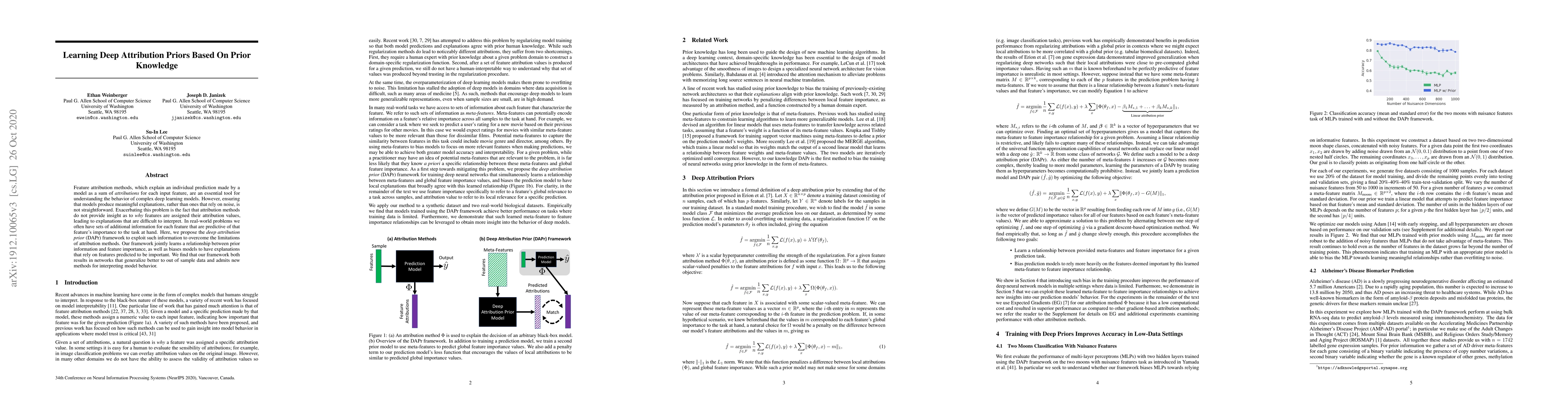 This paper proposes the deep attribution prior (DAPr) framework to enhance the interpretability of deep learning models by leveraging prior knowledge about feature importance. The framework learns to relate prior information to feature attributions, leading to more meaningful and generalizable model explanations.