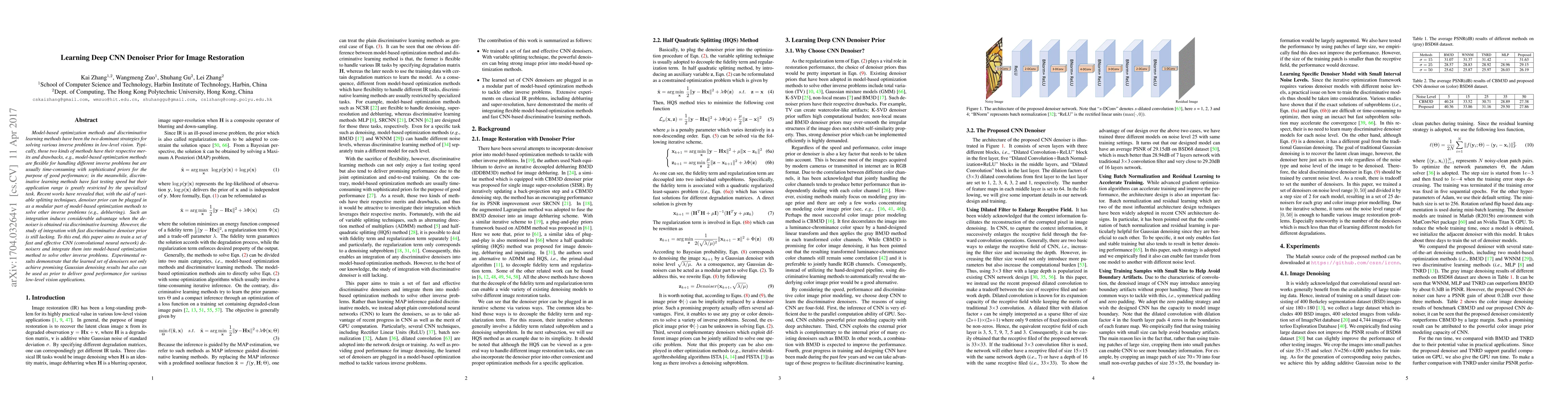 This paper trains fast and effective CNN denoisers and integrates them into model-based optimization methods to solve various inverse problems, achieving promising denoising results and good performance in low-level vision applications. Experimental results show the effectiveness of the learned denoisers as priors for other tasks.