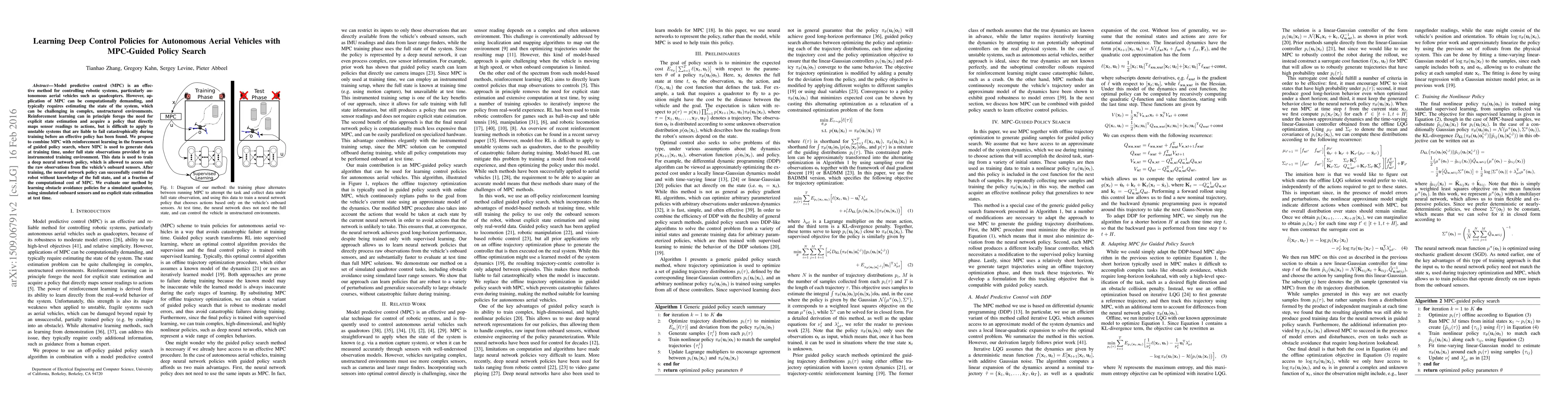 Model predictive control (MPC) is an effective method for controlling robotic systems, particularly autonomous aerial vehicles such as quadcopters. However, application of MPC can be computationally demanding, and typically requires estimating the state of the system, which can be challenging in complex, unstructured environments. Reinforcement learning can in principle forego the need for explicit state estimation and acquire a policy that directly maps sensor readings to actions, but is difficult to apply to unstable systems that are liable to fail catastrophically during training before an effective policy has been found. We propose to combine MPC with reinforcement learning in the framework of guided policy search, where MPC is used to generate data at training time, under full state observations provided by an instrumented training environment. This data is used to train a deep neural network policy, which is allowed to access only the raw observations from the vehicle's onboard sensors. After training, the neural network policy can successfully control the robot without knowledge of the full state, and at a fraction of the computational cost of MPC. We evaluate our method by learning obstacle avoidance policies for a simulated quadrotor, using simulated onboard sensors and no explicit state estimation at test time.