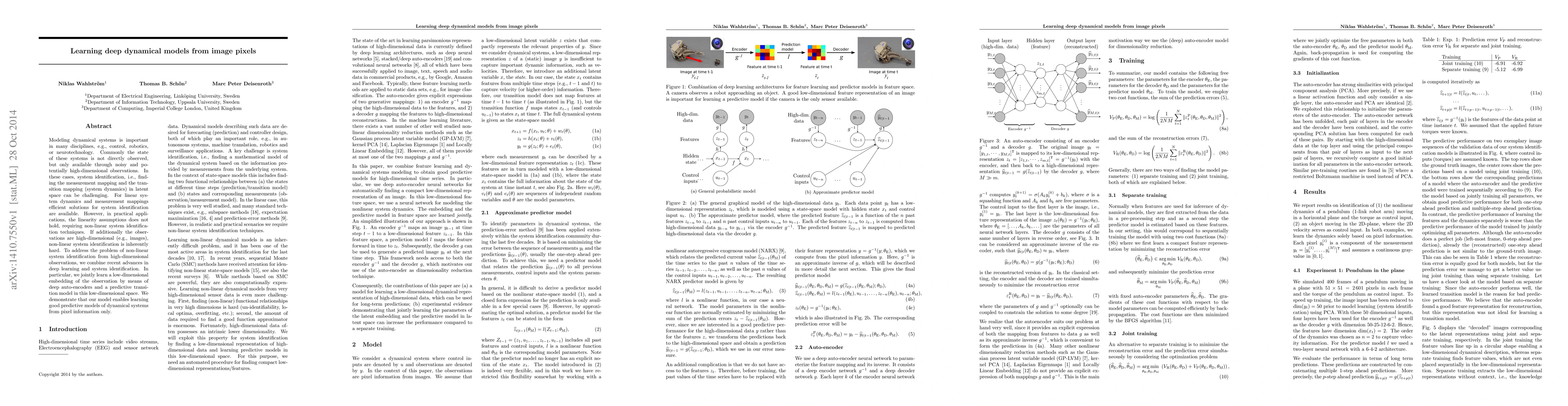 This paper proposes a method to identify non-linear dynamical systems from high-dimensional observations, like images, using deep learning. It combines deep auto-encoders for embedding and a predictive transition model to learn the system dynamics from pixel data.