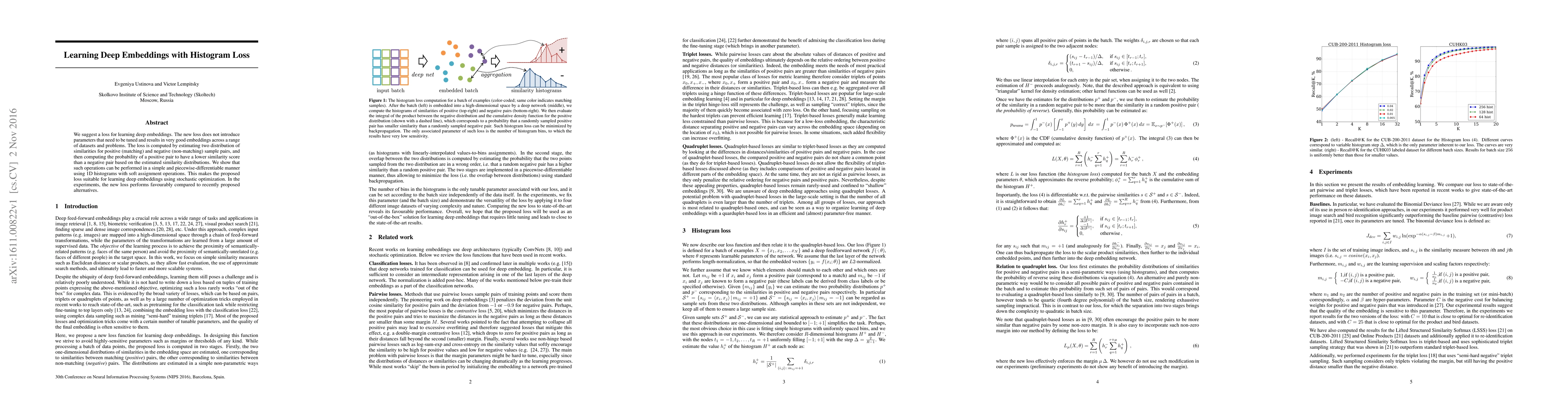 This paper introduces a histogram loss for learning deep embeddings that does not require parameter tuning and performs well across various datasets. The loss estimates similarity distributions for matching and non-matching pairs, computing the probability of a positive pair having a lower similarity score than a negative pair, and is efficiently computed using 1D histograms.