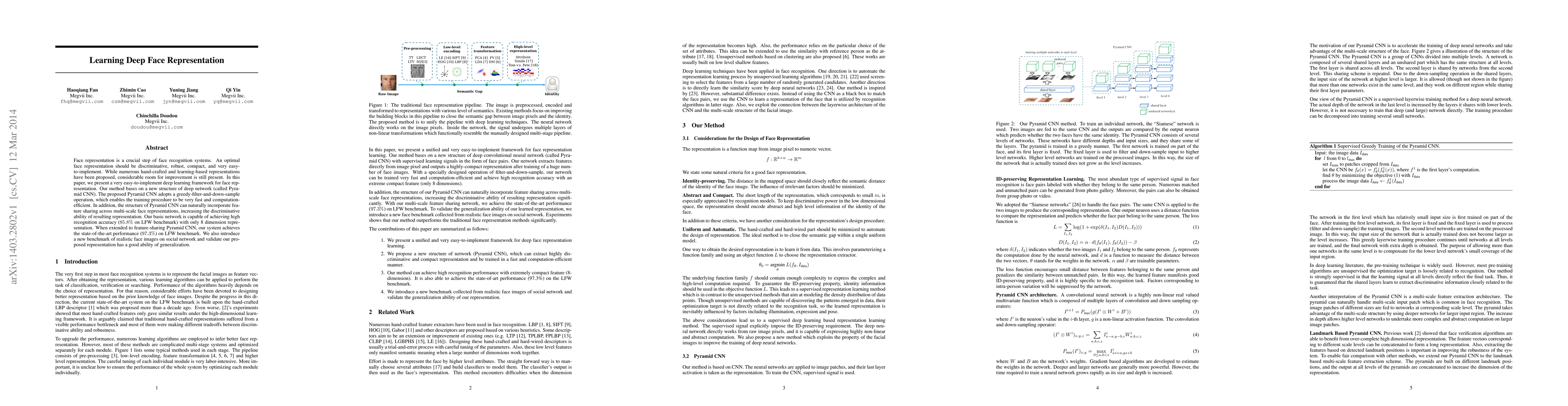This paper proposes a deep learning framework called Pyramid CNN for face representation, achieving state-of-the-art performance on the LFW benchmark with high recognition accuracy and efficient training. The Pyramid CNN structure enhances discriminative ability through multi-scale feature sharing.