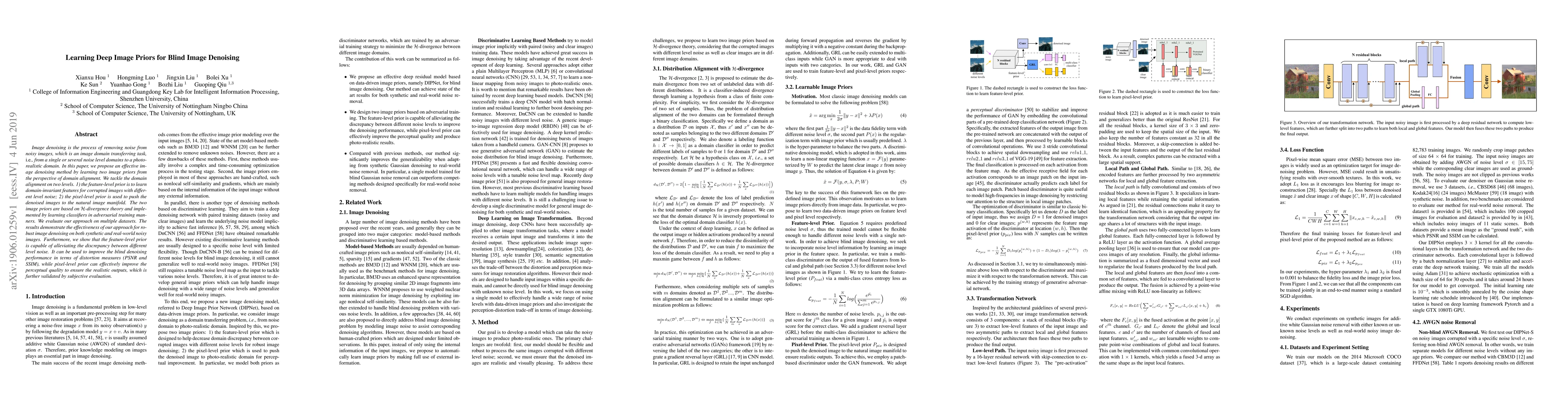 This paper proposes a novel method for blind image denoising by learning deep image priors through domain alignment, utilizing both feature-level and pixel-level priors. The method demonstrates robust performance on synthetic and real-world images, improving both quantitative metrics and perceptual quality.