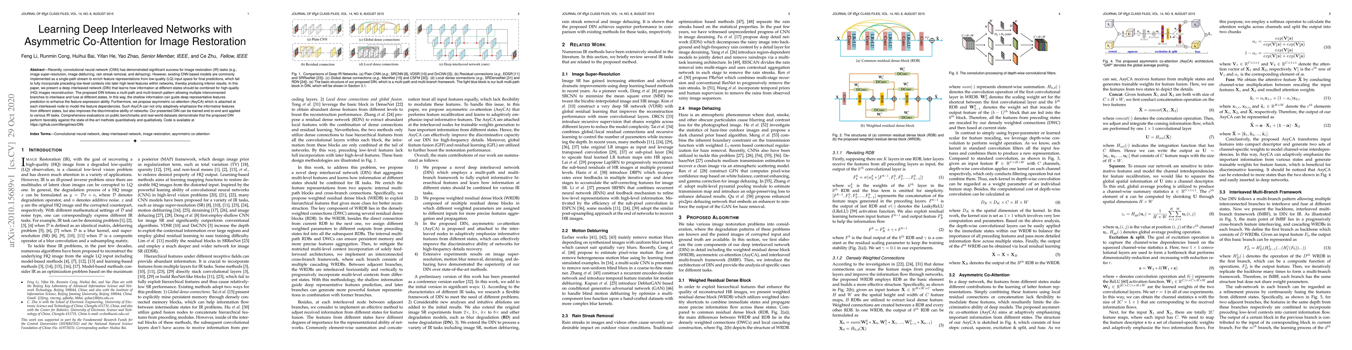 Recently, convolutional neural network (CNN) has demonstrated significant success for image restoration (IR) tasks (e.g., image super-resolution, image deblurring, rain streak removal, and dehazing). However, existing CNN based models are commonly implemented as a single-path stream to enrich feature representations from low-quality (LQ) input space for final predictions, which fail to fully incorporate preceding low-level contexts into later high-level features within networks, thereby producing inferior results. In this paper, we present a deep interleaved network (DIN) that learns how information at different states should be combined for high-quality (HQ) images reconstruction. The proposed DIN follows a multi-path and multi-branch pattern allowing multiple interconnected branches to interleave and fuse at different states. In this way, the shallow information can guide deep representative features prediction to enhance the feature expression ability. Furthermore, we propose asymmetric co-attention (AsyCA) which is attached at each interleaved node to model the feature dependencies. Such AsyCA can not only adaptively emphasize the informative features from different states, but also improves the discriminative ability of networks. Our presented DIN can be trained end-to-end and applied to various IR tasks. Comprehensive evaluations on public benchmarks and real-world datasets demonstrate that the proposed DIN perform favorably against the state-of-the-art methods quantitatively and qualitatively.