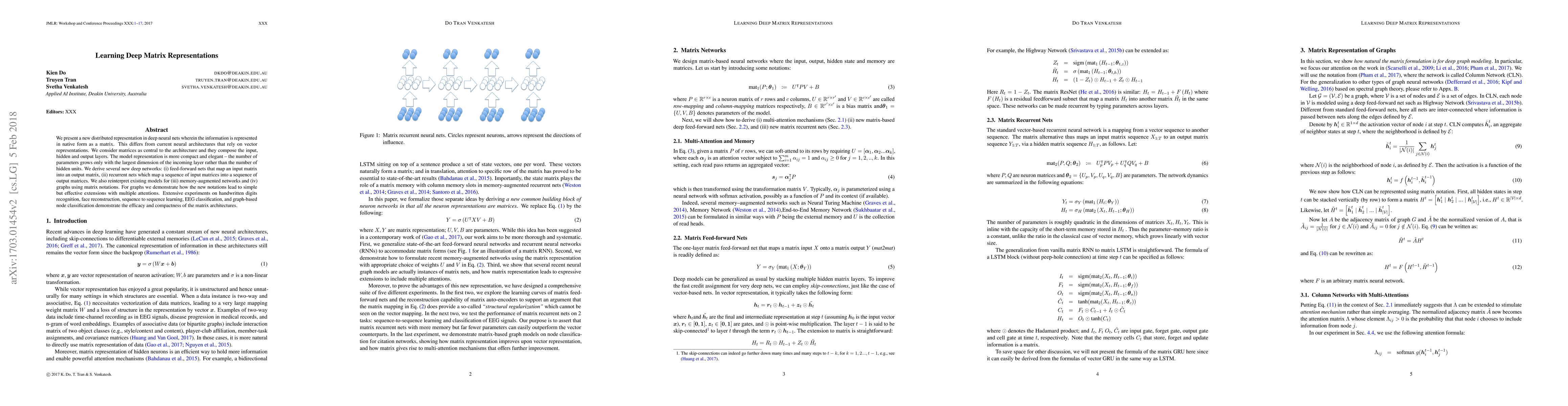 We present a new distributed representation in deep neural nets wherein the information is represented in native form as a matrix. This differs from current neural architectures that rely on vector representations. We consider matrices as central to the architecture and they compose the input, hidden and output layers. The model representation is more compact and elegant -- the number of parameters grows only with the largest dimension of the incoming layer rather than the number of hidden units. We derive several new deep networks: (i) feed-forward nets that map an input matrix into an output matrix, (ii) recurrent nets which map a sequence of input matrices into a sequence of output matrices. We also reinterpret existing models for (iii) memory-augmented networks and (iv) graphs using matrix notations. For graphs we demonstrate how the new notations lead to simple but effective extensions with multiple attentions. Extensive experiments on handwritten digits recognition, face reconstruction, sequence to sequence learning, EEG classification, and graph-based node classification demonstrate the efficacy and compactness of the matrix architectures.