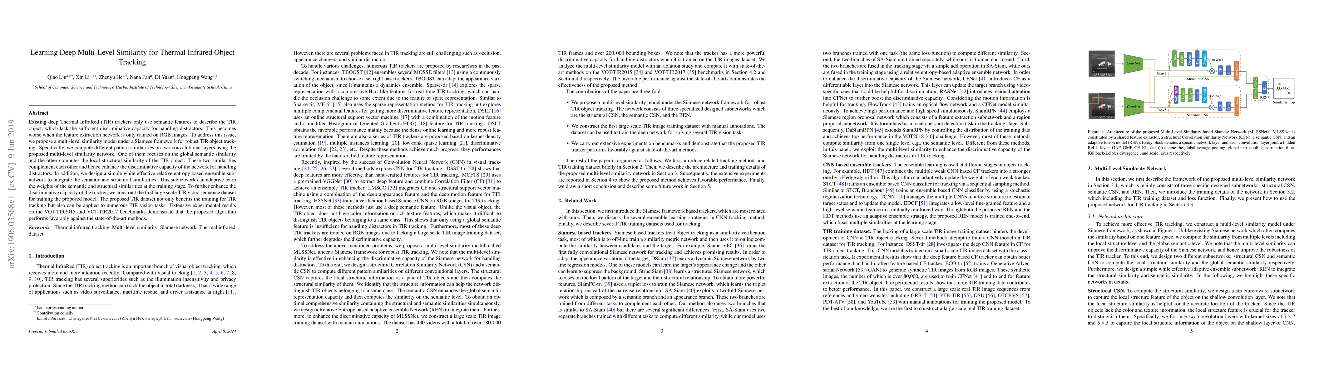 Existing deep Thermal InfraRed (TIR) trackers only use semantic features to describe the TIR object, which lack the sufficient discriminative capacity for handling distractors. This becomes worse when the feature extraction network is only trained on RGB images.To address this issue, we propose a multi-level similarity model under a Siamese framework for robust TIR object tracking. Specifically, we compute different pattern similarities on two convolutional layers using the proposed multi-level similarity network. One of them focuses on the global semantic similarity and the other computes the local structural similarity of the TIR object. These two similarities complement each other and hence enhance the discriminative capacity of the network for handling distractors. In addition, we design a simple while effective relative entropy based ensemble subnetwork to integrate the semantic and structural similarities. This subnetwork can adaptive learn the weights of the semantic and structural similarities at the training stage. To further enhance the discriminative capacity of the tracker, we construct the first large scale TIR video sequence dataset for training the proposed model. The proposed TIR dataset not only benefits the training for TIR tracking but also can be applied to numerous TIR vision tasks. Extensive experimental results on the VOT-TIR2015 and VOT-TIR2017 benchmarks demonstrate that the proposed algorithm performs favorably against the state-of-the-art methods.