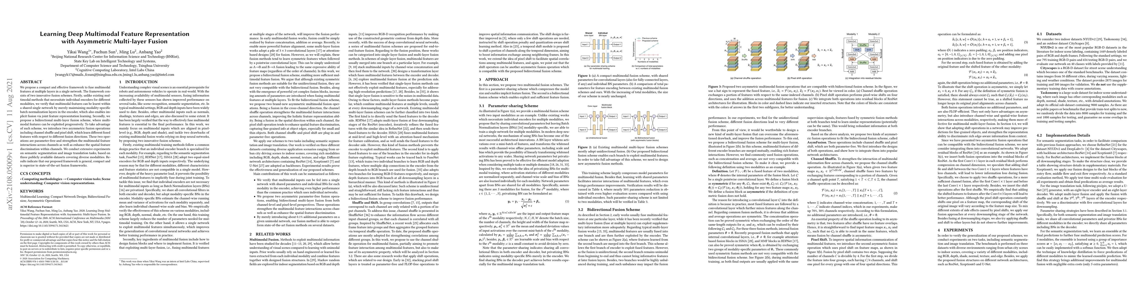 This paper proposes a novel framework for learning deep multimodal feature representations using asymmetric multi-layer fusion. It introduces a shared network with modality-specific batch normalization for implicit fusion and a bidirectional fusion scheme with parameter-free operations to enhance feature interactions. Experimental results show superior performance on semantic segmentation and image translation tasks.