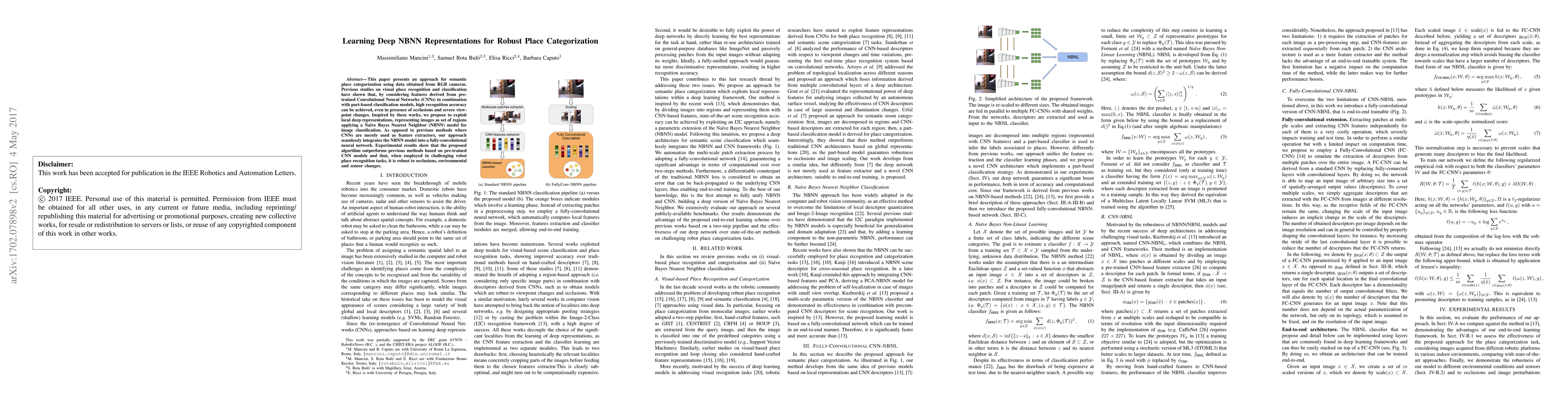 This paper presents an approach for semantic place categorization using data obtained from RGB cameras. Previous studies on visual place recognition and classification have shown that, by considering features derived from pre-trained Convolutional Neural Networks (CNNs) in combination with part-based classification models, high recognition accuracy can be achieved, even in presence of occlusions and severe viewpoint changes. Inspired by these works, we propose to exploit local deep representations, representing images as set of regions applying a Na\"{i}ve Bayes Nearest Neighbor (NBNN) model for image classification. As opposed to previous methods where CNNs are merely used as feature extractors, our approach seamlessly integrates the NBNN model into a fully-convolutional neural network. Experimental results show that the proposed algorithm outperforms previous methods based on pre-trained CNN models and that, when employed in challenging robot place recognition tasks, it is robust to occlusions, environmental and sensor changes.