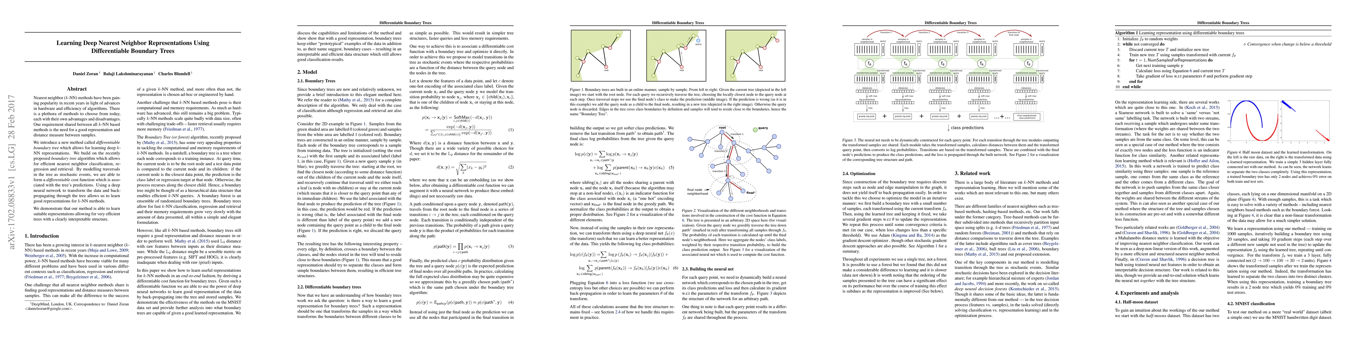 Nearest neighbor (kNN) methods have been gaining popularity in recent years in light of advances in hardware and efficiency of algorithms. There is a plethora of methods to choose from today, each with their own advantages and disadvantages. One requirement shared between all kNN based methods is the need for a good representation and distance measure between samples. We introduce a new method called differentiable boundary tree which allows for learning deep kNN representations. We build on the recently proposed boundary tree algorithm which allows for efficient nearest neighbor classification, regression and retrieval. By modelling traversals in the tree as stochastic events, we are able to form a differentiable cost function which is associated with the tree's predictions. Using a deep neural network to transform the data and back-propagating through the tree allows us to learn good representations for kNN methods. We demonstrate that our method is able to learn suitable representations allowing for very efficient trees with a clearly interpretable structure.
