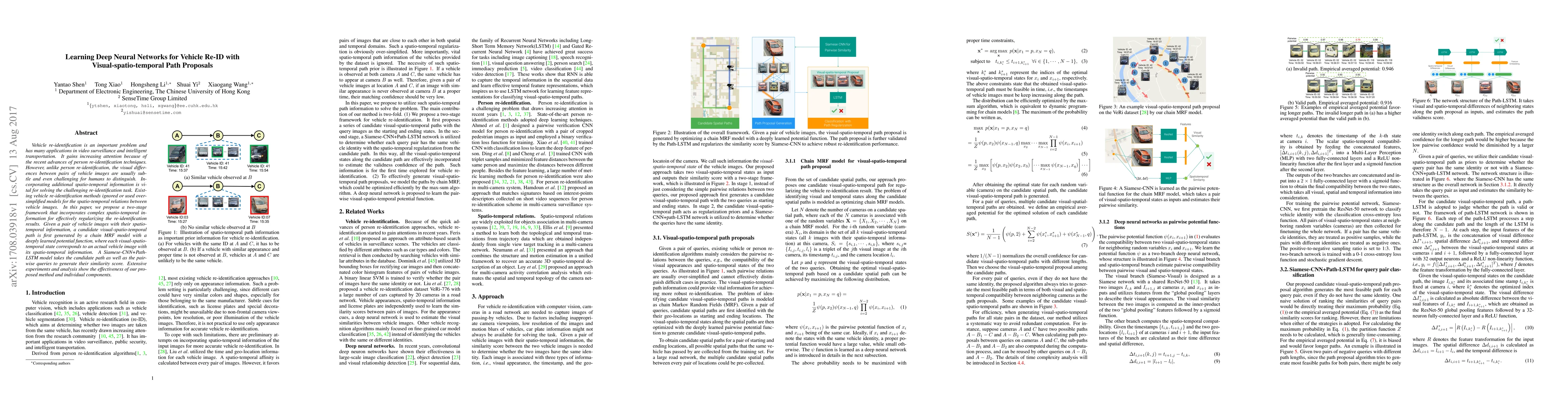 This paper proposes a two-stage framework for vehicle re-identification that uses deep neural networks and complex spatio-temporal path proposals to enhance identification accuracy. The method generates visual-spatio-temporal paths using a chain MRF model and evaluates similarity with a Siamese-CNN+Path-LSTM model, demonstrating improved performance over existing methods.