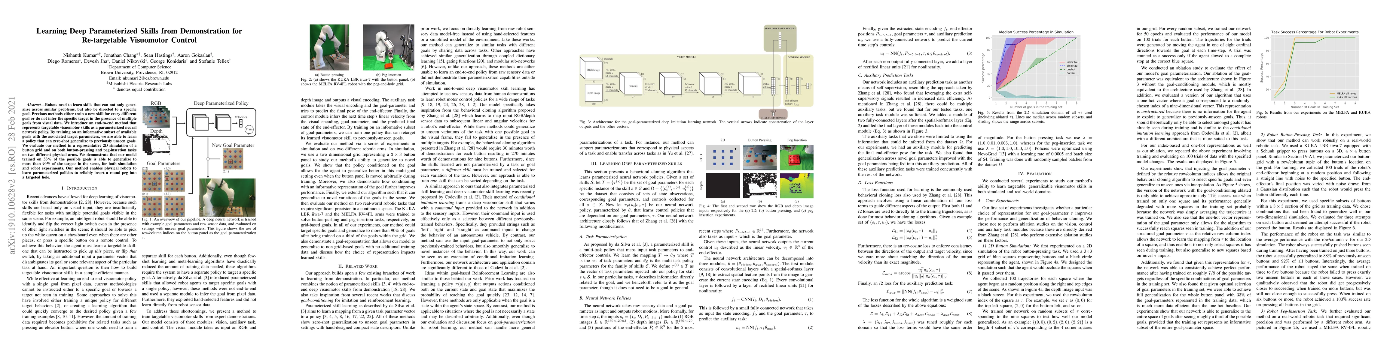 Robots need to learn skills that can not only generalize across similar problems but also be directed to a specific goal. Previous methods either train a new skill for every different goal or do not infer the specific target in the presence of multiple goals from visual data. We introduce an end-to-end method that represents targetable visuomotor skills as a goal-parameterized neural network policy. By training on an informative subset of available goals with the associated target parameters, we are able to learn a policy that can zero-shot generalize to previously unseen goals. We evaluate our method in a representative 2D simulation of a button-grid and on both button-pressing and peg-insertion tasks on two different physical arms. We demonstrate that our model trained on 33% of the possible goals is able to generalize to more than 90% of the targets in the scene for both simulation and robot experiments. We also successfully learn a mapping from target pixel coordinates to a robot policy to complete a specified goal.