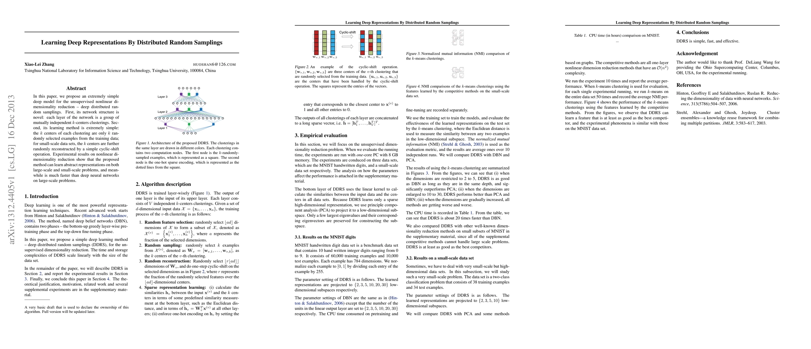 This paper introduces a novel deep model for unsupervised nonlinear dimensionality reduction called deep distributed random samplings, which employs a stack of unsupervised bootstrap aggregating. The model uses a unique network structure with independent $k$-centers clusterings and a simple learning method that selects random examples from training data as $k$ centers, demonstrating faster performance on large-scale problems compared to deep neural networks.