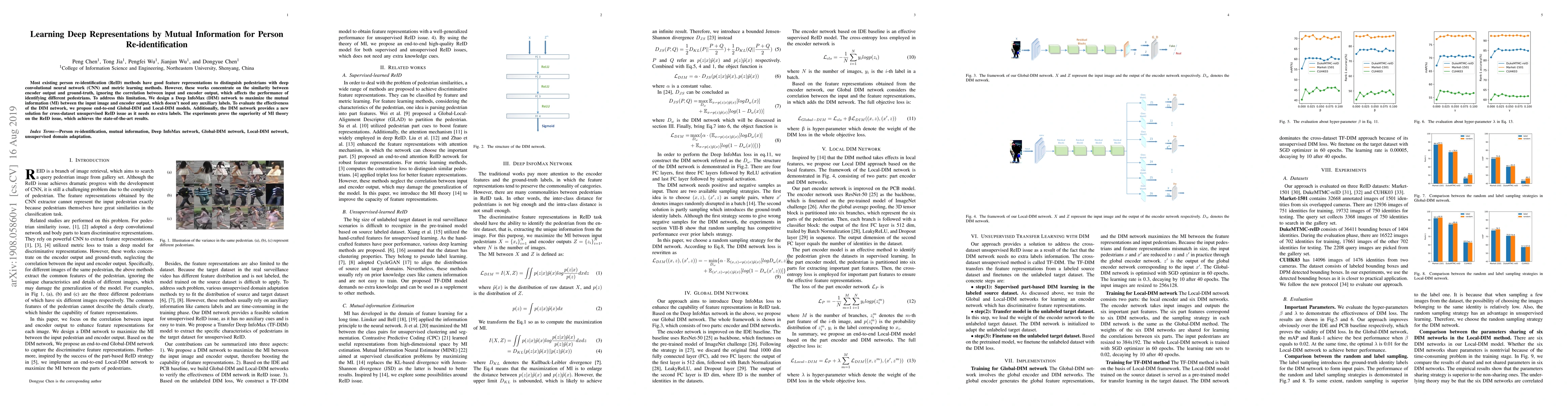 Most existing person re-identification (ReID) methods have good feature representations to distinguish pedestrians with deep convolutional neural network (CNN) and metric learning methods. However, these works concentrate on the similarity between encoder output and ground-truth, ignoring the correlation between input and encoder output, which affects the performance of identifying different pedestrians. To address this limitation, We design a Deep InfoMax (DIM) network to maximize the mutual information (MI) between the input image and encoder output, which doesn't need any auxiliary labels. To evaluate the effectiveness of the DIM network, we propose end-to-end Global-DIM and Local-DIM models. Additionally, the DIM network provides a new solution for cross-dataset unsupervised ReID issue as it needs no extra labels. The experiments prove the superiority of MI theory on the ReID issue, which achieves the state-of-the-art results.