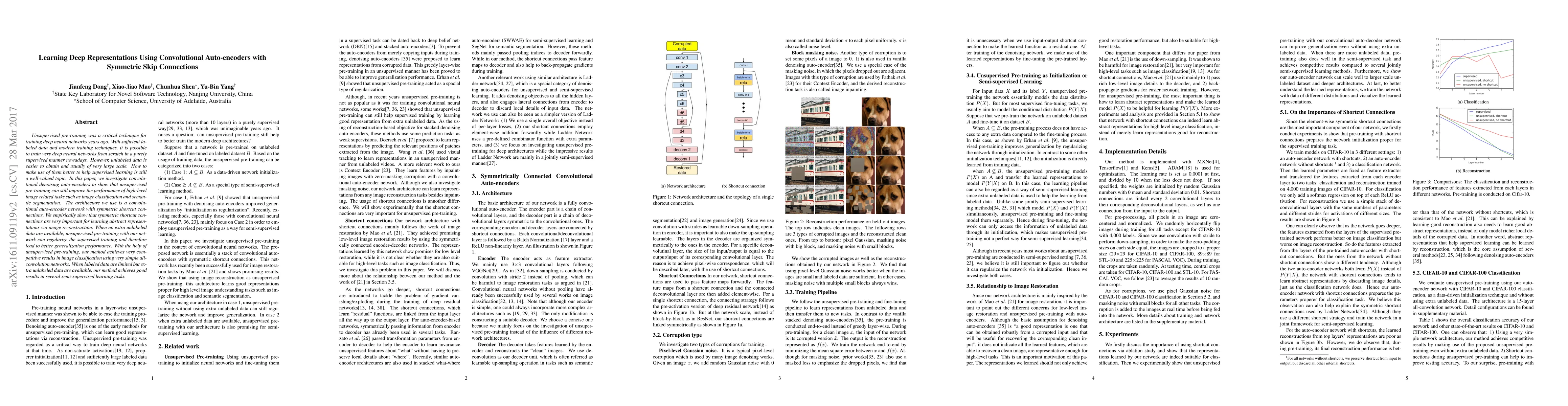 Unsupervised pre-training was a critical technique for training deep neural networks years ago. With sufficient labeled data and modern training techniques, it is possible to train very deep neural networks from scratch in a purely supervised manner nowadays. However, unlabeled data is easier to obtain and usually of very large scale. How to make use of them better to help supervised learning is still a well-valued topic. In this paper, we investigate convolutional denoising auto-encoders to show that unsupervised pre-training can still improve the performance of high-level image related tasks such as image classification and semantic segmentation. The architecture we use is a convolutional auto-encoder network with symmetric shortcut connections. We empirically show that symmetric shortcut connections are very important for learning abstract representations via image reconstruction. When no extra unlabeled data are available, unsupervised pre-training with our network can regularize the supervised training and therefore lead to better generalization performance. With the help of unsupervised pre-training, our method achieves very competitive results in image classification using very simple all-convolution networks. When labeled data are limited but extra unlabeled data are available, our method achieves good results in several semi-supervised learning tasks.