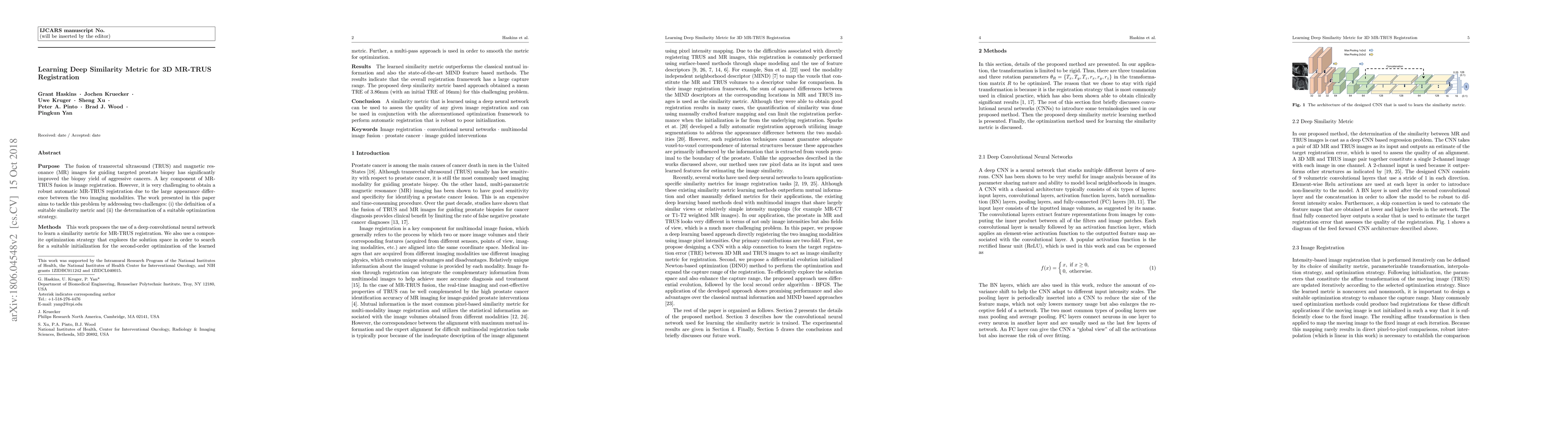 This paper proposes a deep learning approach to automatically register MR and TRUS images for prostate biopsy, addressing the challenge of large appearance differences between the modalities. The method uses a deep convolutional neural network to learn a robust similarity metric and an optimization strategy to achieve a mean target registration error (TRE) of 3.86mm, significantly improving upon existing methods.