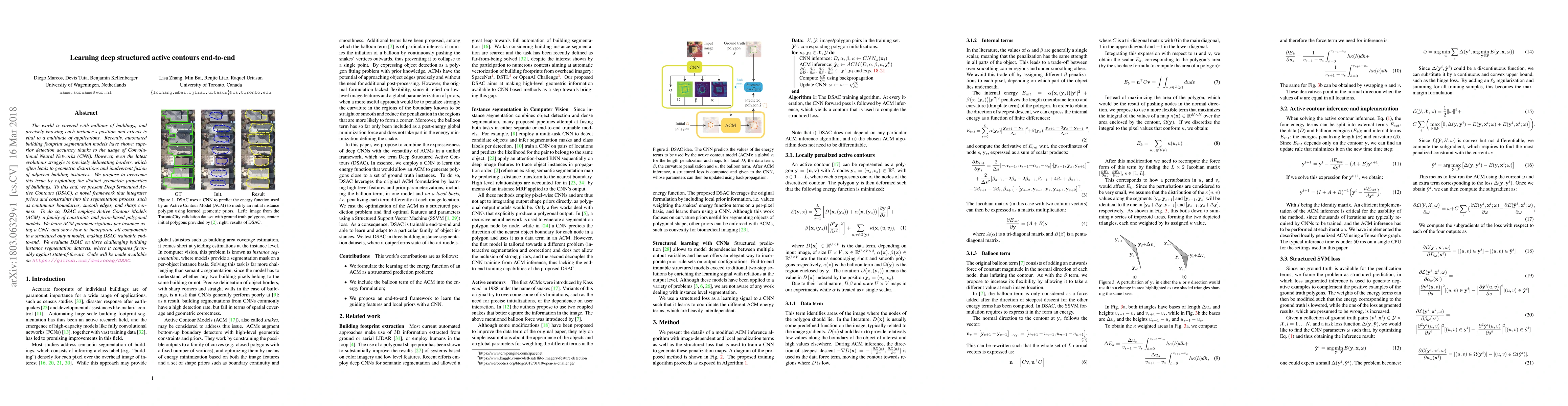 This paper proposes Deep Structured Active Contours (DSAC), a novel framework that integrates geometric constraints into CNN-based building segmentation to improve boundary delineation. DSAC employs Active Contour Models and learns instance-specific parameterizations end-to-end, achieving superior segmentation accuracy on challenging datasets.