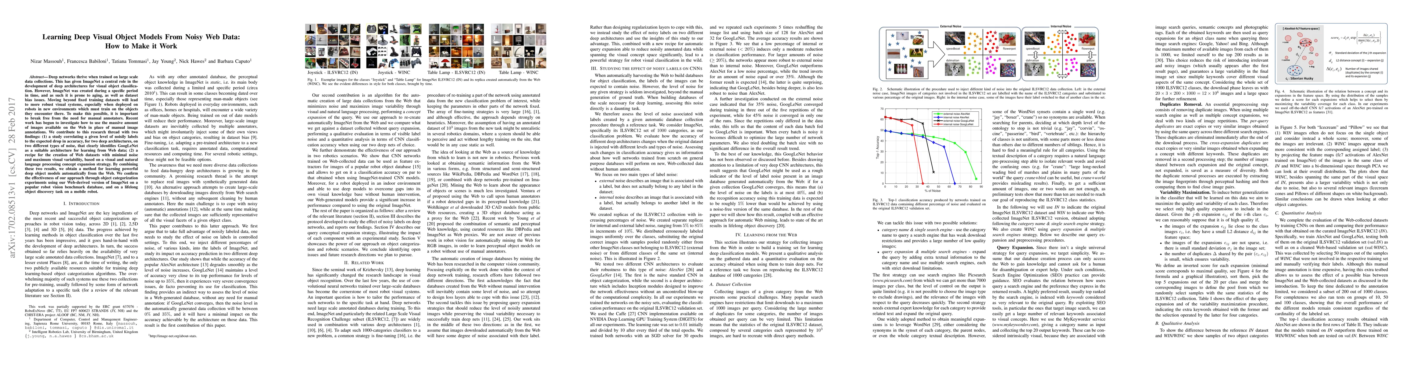 Deep networks thrive when trained on large scale data collections. This has given ImageNet a central role in the development of deep architectures for visual object classification. However, ImageNet was created during a specific period in time, and as such it is prone to aging, as well as dataset bias issues. Moving beyond fixed training datasets will lead to more robust visual systems, especially when deployed on robots in new environments which must train on the objects they encounter there. To make this possible, it is important to break free from the need for manual annotators. Recent work has begun to investigate how to use the massive amount of images available on the Web in place of manual image annotations. We contribute to this research thread with two findings: (1) a study correlating a given level of noisily labels to the expected drop in accuracy, for two deep architectures, on two different types of noise, that clearly identifies GoogLeNet as a suitable architecture for learning from Web data; (2) a recipe for the creation of Web datasets with minimal noise and maximum visual variability, based on a visual and natural language processing concept expansion strategy. By combining these two results, we obtain a method for learning powerful deep object models automatically from the Web. We confirm the effectiveness of our approach through object categorization experiments using our Web-derived version of ImageNet on a popular robot vision benchmark database, and on a lifelong object discovery task on a mobile robot.