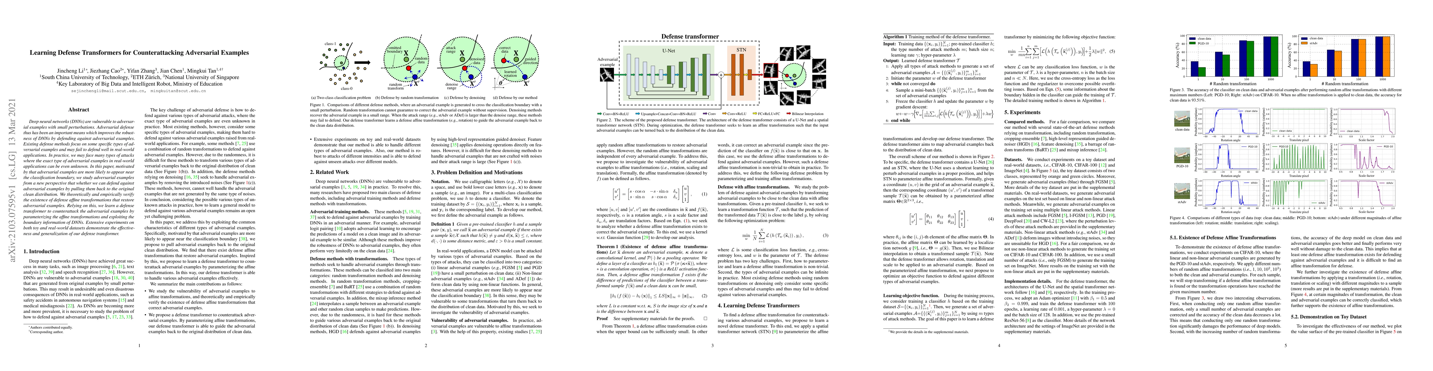 This paper proposes a defense transformer that learns affine transformations to counteract adversarial examples by pulling them back to the original clean distribution, leveraging boundary information of DNNs. Experiments show the effectiveness and generalization of this approach across various datasets.