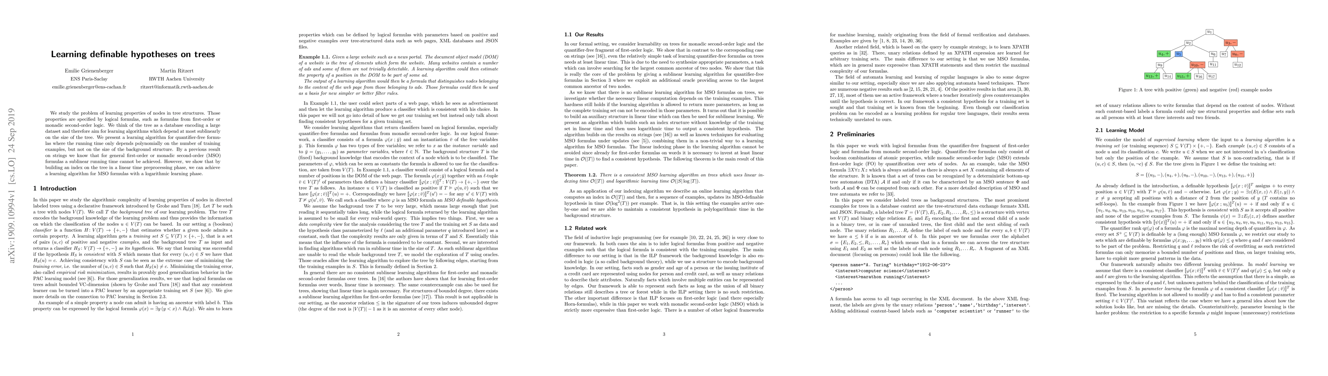 This paper presents a learning algorithm for definable hypotheses on tree structures, specifically focusing on logical formulas like first-order and monadic second-order logic. The algorithm achieves polynomial time complexity relative to training examples but only logarithmic time complexity relative to the tree size through a linear-time preprocessing index.