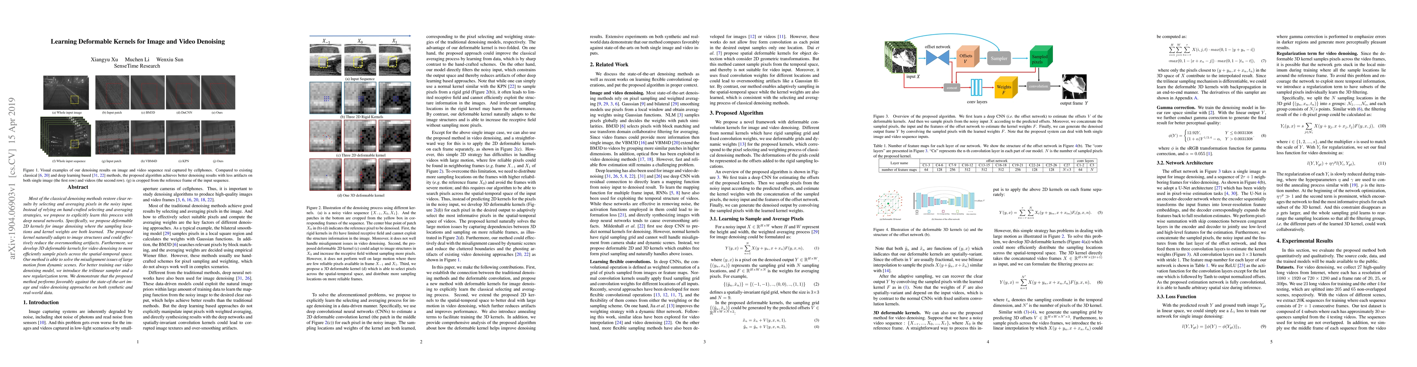 This paper proposes deformable kernels learned through deep neural networks for image and video denoising, which adaptively select sampling locations and weights to reduce oversmoothing artifacts. The method includes 2D kernels for images and 3D kernels for videos, addressing misalignment issues in dynamic scenes, and outperforms existing denoising techniques.